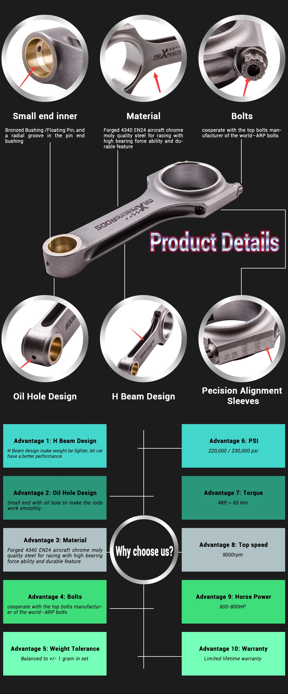 Количество: 4 шт., как показано на картинкеБолты: включая оригинальные 3/8 "ARP 2000 болтыПримечание: дополнительные расходы на модернизацию болтов ARP L19Гарантия: 2 года гарантии.Номинальная мощность: около 600-800 л.с.
