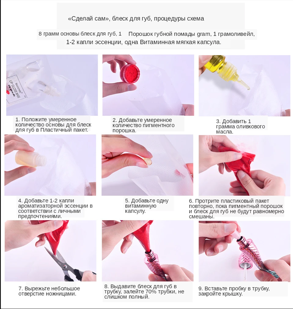 Если вы покупаете комплект, вы получите все необходимые материалы. Сделайте свой собственный блеск для губ, безопасным и значимым. Также у нас есть дополнительный блеск для губ, пигмент и аромат для вас. Как использовать: 1. Поместите умеренное количество основы для блеска для губ в полиэтиленовый пакет 2. Добавьте умеренное количество пигментного порошка 3. Добавьте 1 г оливкового масла 4. Добавьте 1-2 капли аромата в соответствии с личными предпочтениями 5. Натирайте полиэтиленовый пакет повторно, пока пигментный порошок и блеск для губ не будут равномерно смешаны 6. Вырежьте маленькое отверстие ножницами 7. Выдавите блеск для губ, вставьте в трубку, наполнив 70% трубки, не слишком полный 8. Вставьте пробку в трубку, закройте крышку