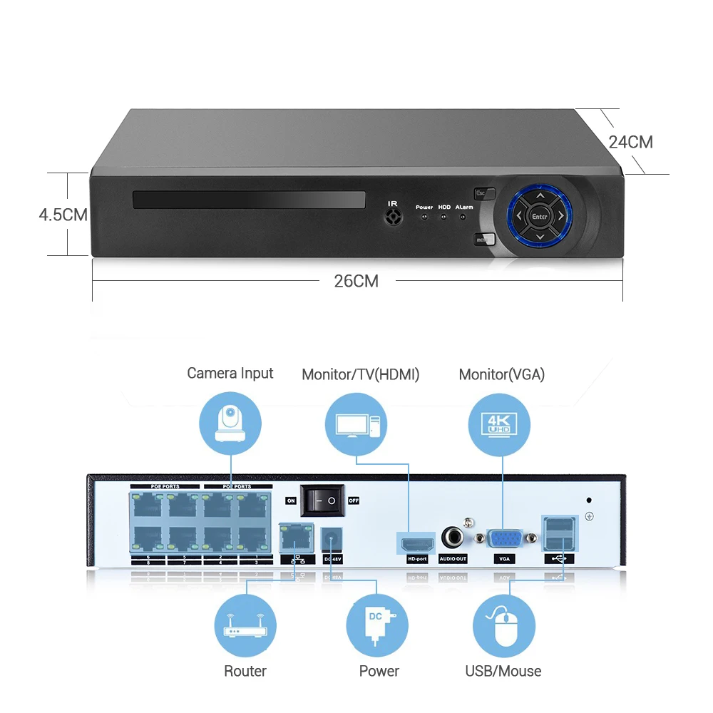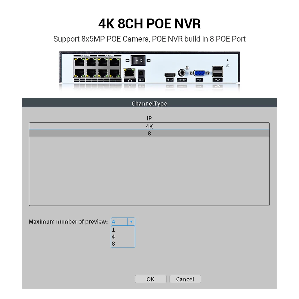 Этот 8CH POE NVR может соединяться с 8 шт. 48 вольт постоянного тока (EEE802.3af ) 4K POE камера