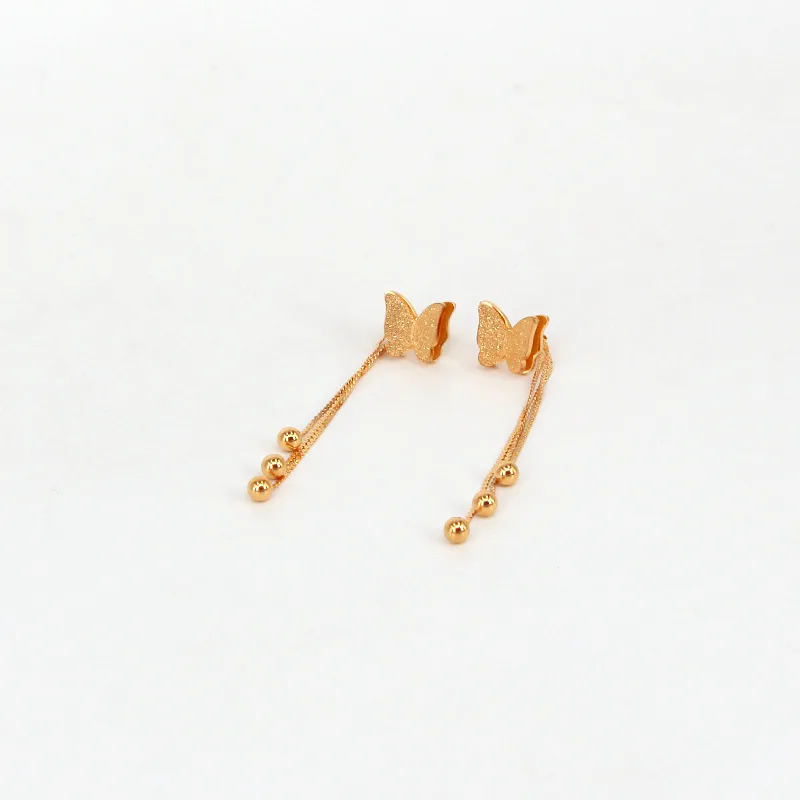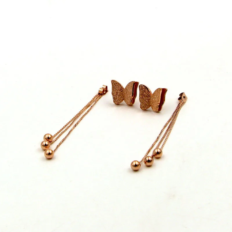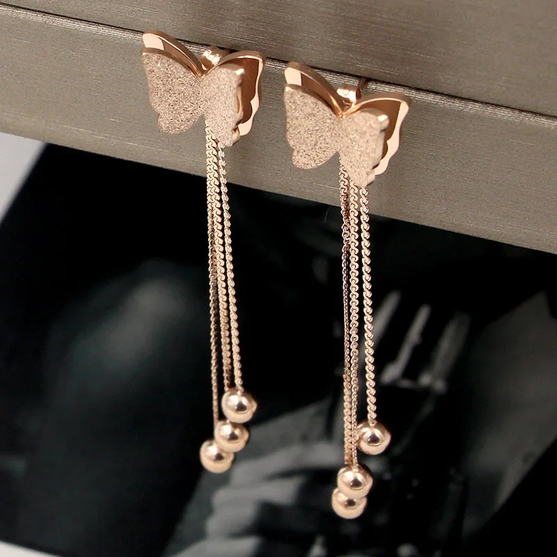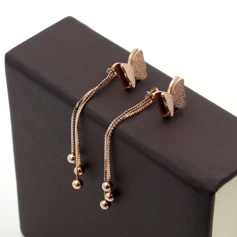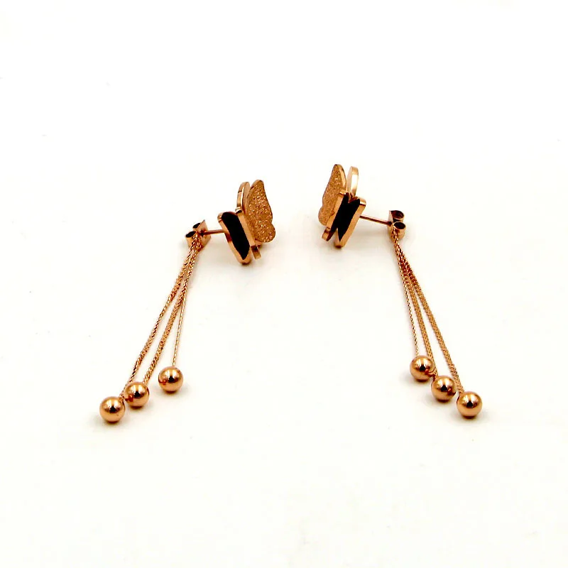 Модные матовые серьги-бабочки из розового золота, висячие серьги с тремя стальными шариками и кисточками для женщин, оптовая продажа ювелирных изделий