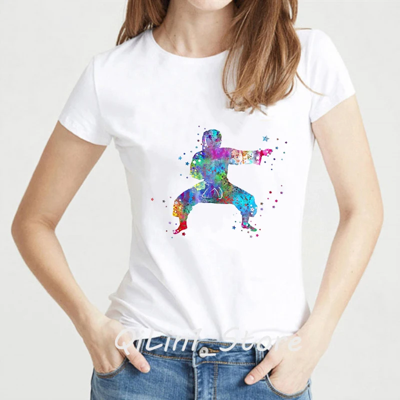 Новинка, женская футболка, модная популярная стильная футболка, женская футболка с акварельным принтом для девочек-карате, футболка с принтом, женские топы в уличном стиле