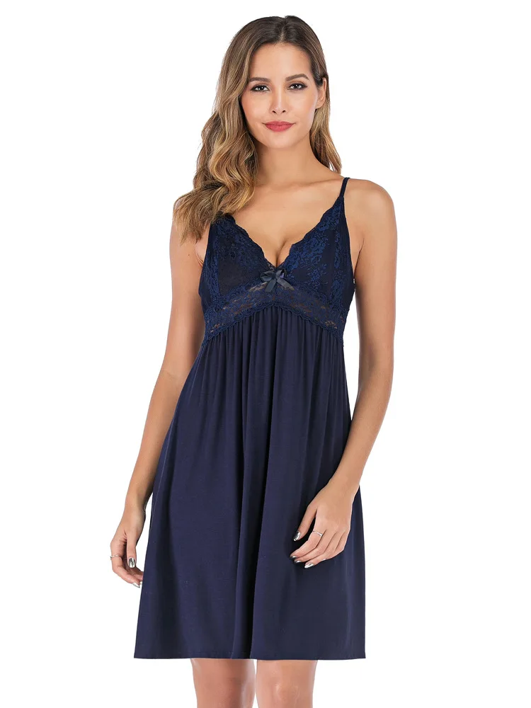 Женская ночная рубашка, темно-синяя пикантная ночная рубашка из модала и хлопка, ночная рубашка без рукавов, Высококачественная ночная рубашка, кружевная пижама для женщин