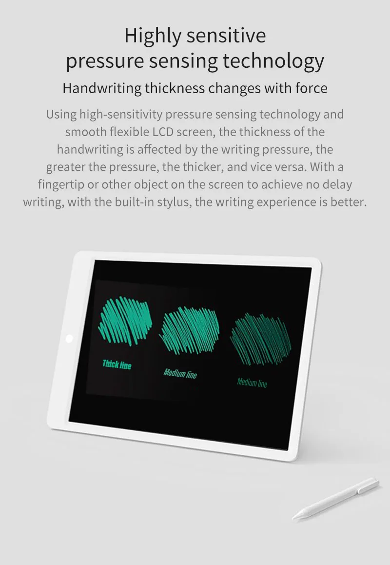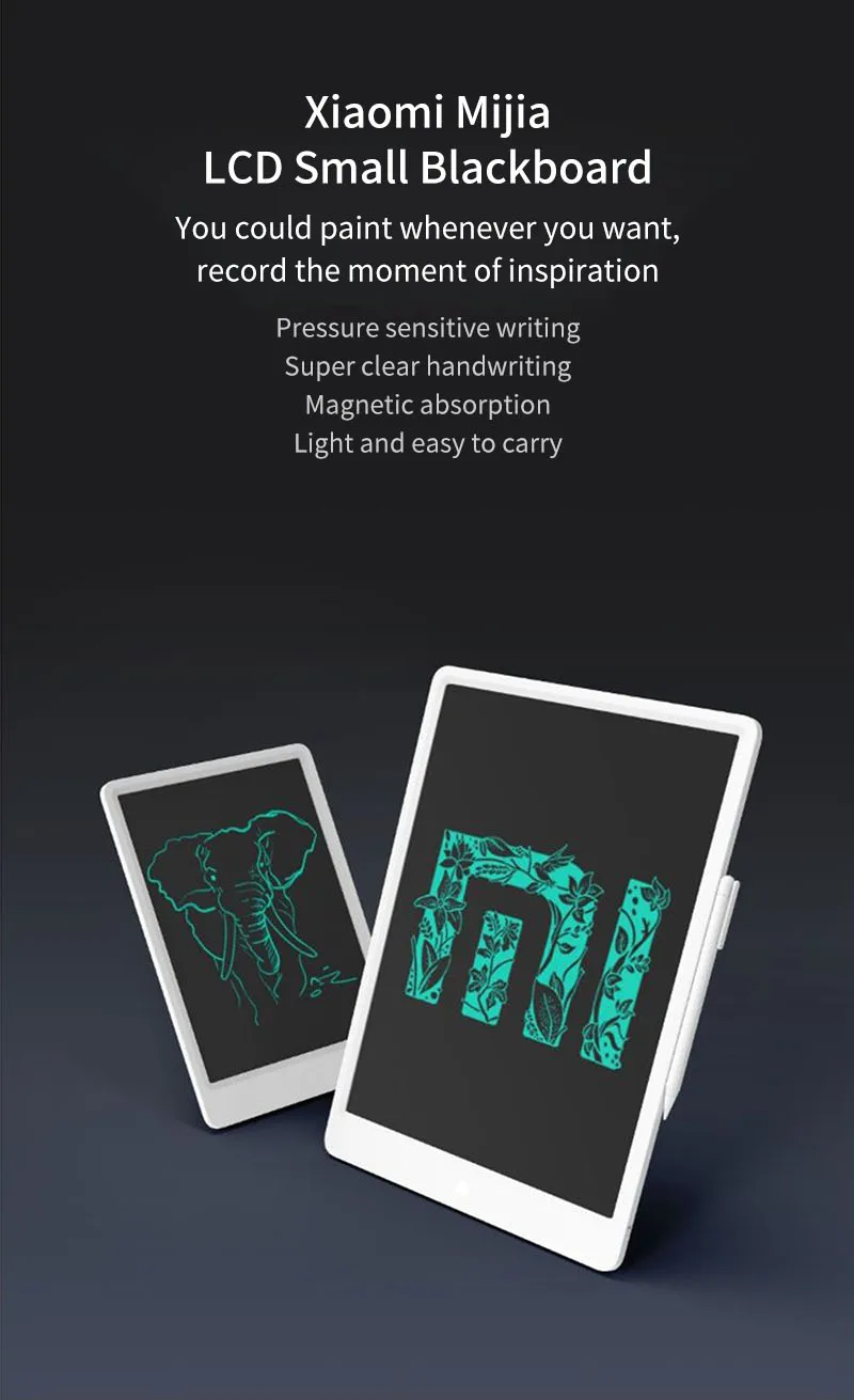 Описание: Xiaomi Mijia LCD маленькая доска с ручкой -Вы можете рисовать, когда захотите, записывайте момент вдохновенияЧувствительное к давлению письмо; Супер чистый почерк; Магнитное поглощение; Светильник, легко носить с собой. -Индивидуальная Формула ЖК-пленки, четкий почеркМаленькая доска Xiaomi Mijia LCD принимает индивидуальную формулу жидкокристаллической пленки, сине-зеленый почерк, четкий и привлекательный дисплей, как реальный опыт написания традиционной бумаги, так и плавный опыт ЖК-экрана. -Высокочувствительная технология определения давленияТолщина почерка меняется с силой. -Одна кнопка, чтобы очистить низкое энергопотребление, длительный срок службы батареи является более беззаботнымЖК-экран с нулевой мощностью потребляет только небольшое количество энергии, когда он очищается. Если вы удаляете 100 раз в день, аккумулятор кнопки используется для 365 дней. -Ультрамагнитный стилус-светильник для более удобного храненияВес ручки составляет всего 7 г, и вся машина использует четыре неодимовых магнита из железного бора, которые обладают сильной адсорбционной способностью и долговечной магнитной силой. -Ультратонкий корпус, легко носить с собойТонкий корпус 7 мм тонкий, светильник и портативный, что снижает нагрузку на путешествия.