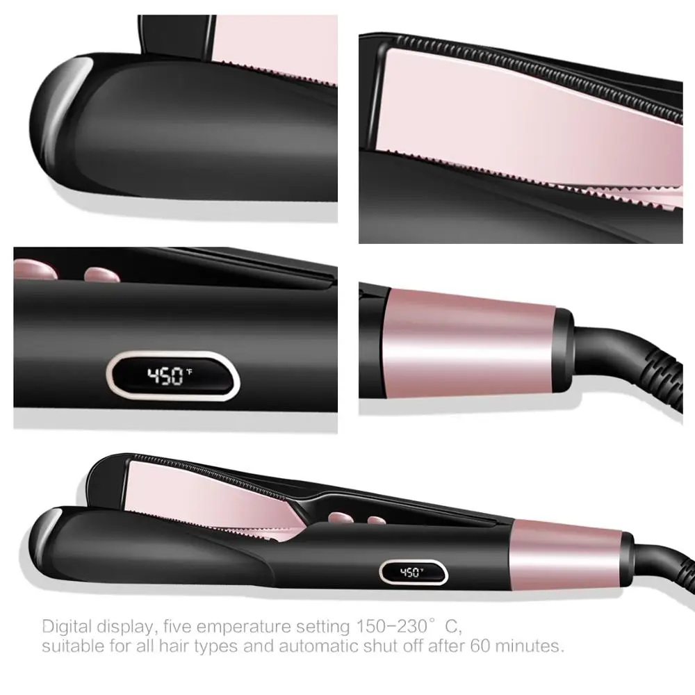 2-в-1 выпрямители для волос и бигуди: Керамика утюжок для волос имеет удобный дизайн, который дает вам как инструменты для укладки волос в одном. Высококачественная нагревательная панель с керамическим покрытием, равномерное нагревание, дизайн зубной гребни, легко выпрямить, волна или завивка. Уникальный дизайн: шина всегда держит бесшовную форму, уменьшает повреждение волос, делает форму более естественной и более гладкой и удобной. Быстро нагревается за 15 секунд, экономит ваше время ЖК-дисплей: используется технология быстрого нагрева PTC, профессиональный утюжок для укладки волос 2 в 1 может быстро нагреваться до 450 °F в течение 30 секунд после загрузки, отличное время и энергосбережение. Защита безопасности: керамический плоский утюг автоматически отключается после 60 минут неиспользования для дополнительного спокойствия и поставляется с изолированным мешком и перчатками для доставки, чтобы держать вас подальше от ожогов. Передняя часть фюзеляжа спроектирована с теплоизоляцией и защитой от глажки. Двойное напряжение по всему миру: утюжок для выпрямления волос и Плойка для завивки с двойным напряжением 110-240 В по всему миру, свободно перемещается с поворотным шнуром на 360 градусов. Особенности товара: Керамика для гладкого стиля и блестящей отделки Специальный круглый дизайн: округлые пластины для прямой или волнистой прически