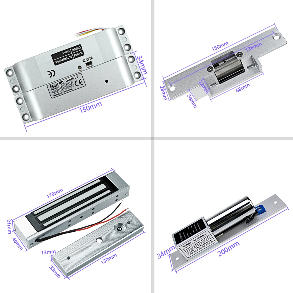 Посылка включает в себя: кнопочную панель управления доступом + блок питания + 180 кг Электрический магнитный замок + кнопка выхода + 5 брелоков
