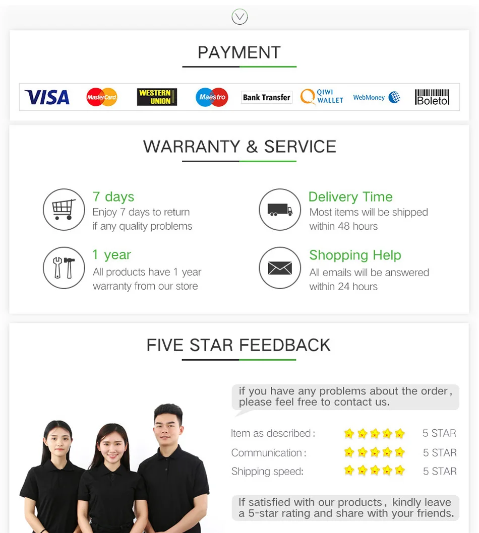 Вам также может понравиться 1: Мы принимаем индивидуальный дизайн и смешанные оптовые продажи, мы обещаем поставлять продукцию лучшего качества, лучшие цены и лучший сервис. 2: мы постоянно запускаем новые проекты, которые соответствуют международным рыночным стандартам. Пожалуйста, не стесняйтесь связаться с нами для получения дополнительной информации. 3: профессиональная логистическая упаковка, чтобы сделать продукты более безопасными для транспортировки. 4: если у вас есть какие-либо требования к упаковке, пожалуйста, свяжитесь с нами, 5: если вам нужны товары срочно, пожалуйста, выберите способ доставки DHL или EMS и оплатите дополнительную доставку. Политика Возврата 1: Мы гарантируем нулевой риск покупки. 2: Мы предлагаем вам полный возврат средств, если продукт имеет какие-либо проблемы с качеством. 3: Если вы не удовлетворены любыми вопросами о нашей продукции в дополнение к качеству продукции, вы хотите изменить товар или вернуть товар. Вы должны оплатить дополнительные расходы по доставке и возвращенные товары должны быть сохранены в их первоначальном состоянии. Отзывы 1: мы всегда предлагаем Вам самые низкие цены на лучшие товары и услуги. 2: ваши отзывы очень важны для нас, пожалуйста, уделите несколько секунд, чтобы оставить отличные отзывы, если вы удовлетворены нашим продуктом или сервисом, большое спасибо! 3: пожалуйста, свяжитесь с нами перед тем, как оставить нейтральный или негативный отзыв. Мы сделаем все возможное, чтобы решить проблему и оставить вам счастливое настроение покупок здесь. Спасибо!