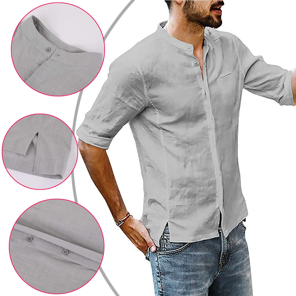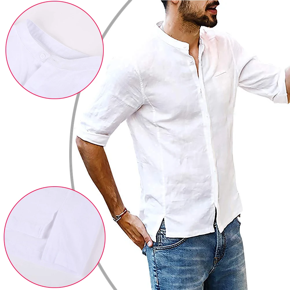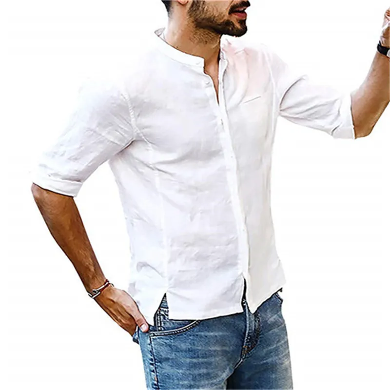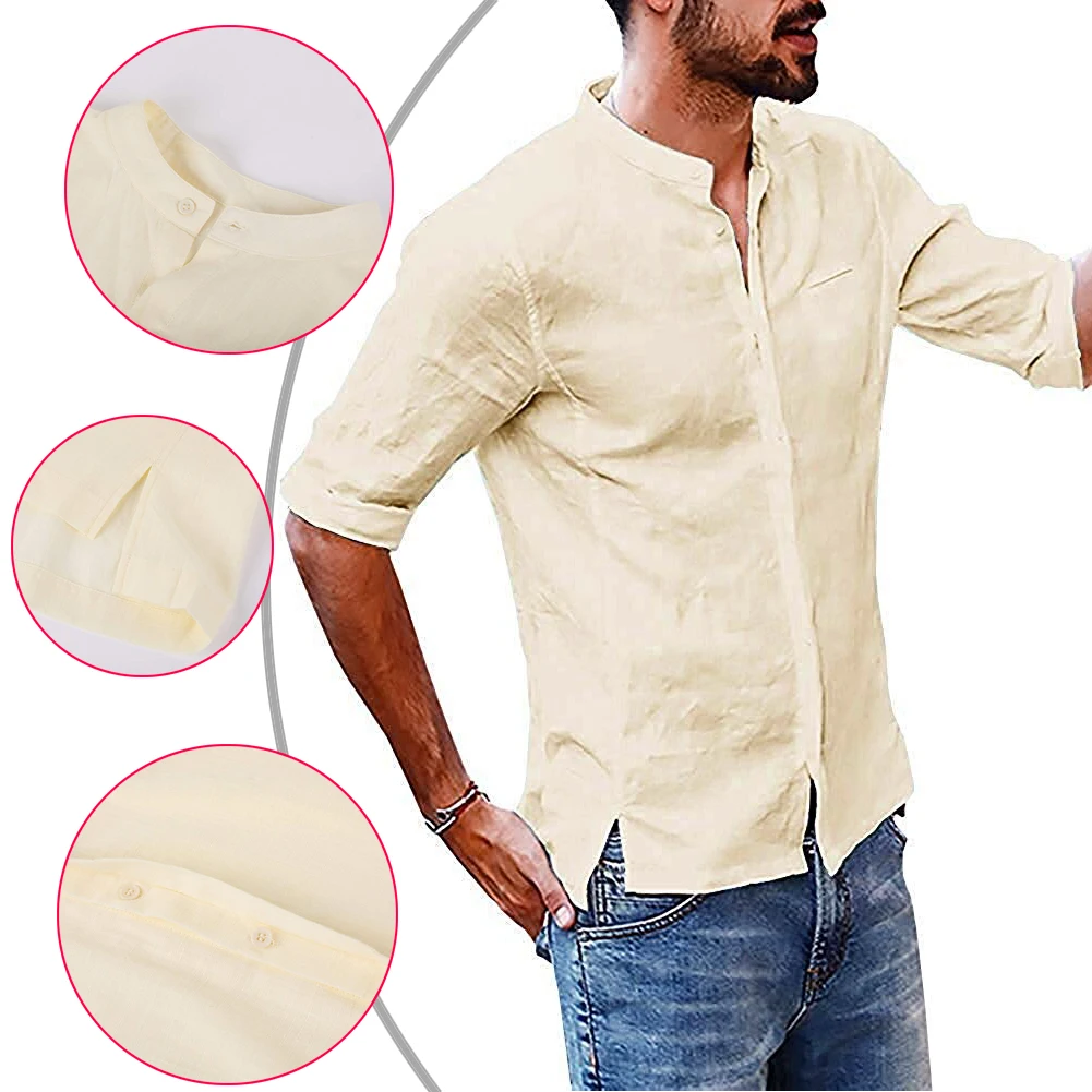 Рубашка мужская с V-образным вырезом, Повседневная блуза из хлопка и льна, Однотонная футболка с рукавом 2020, в наличии 4 цвета, лето 34