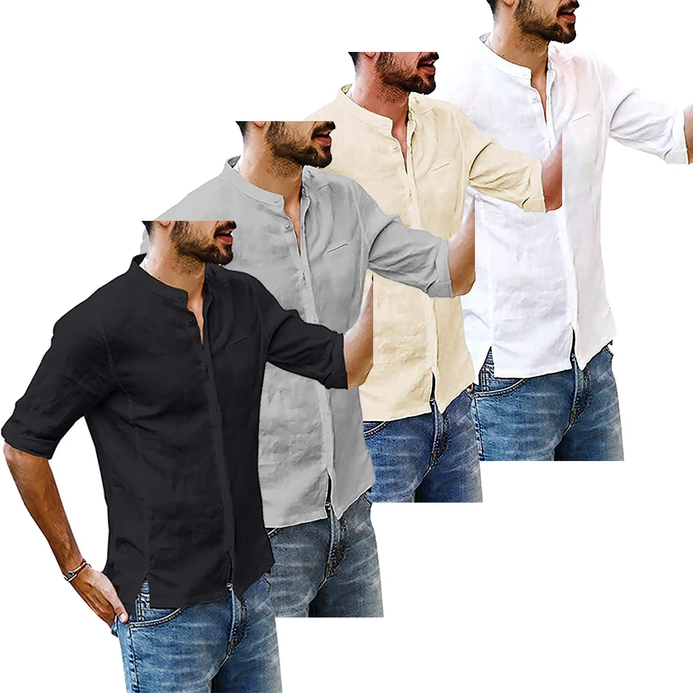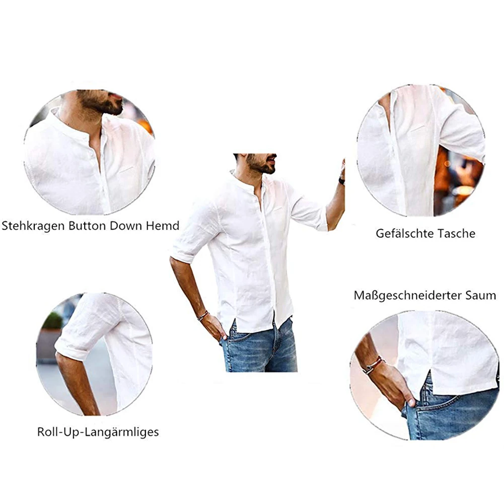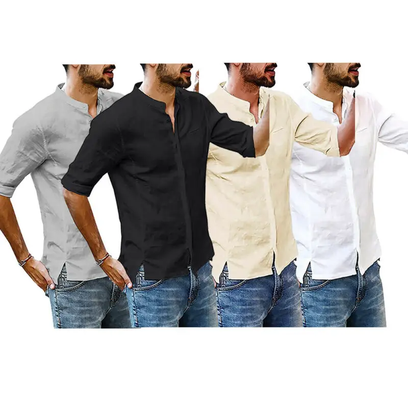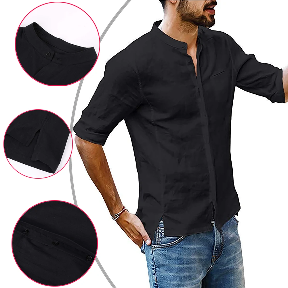Рубашка мужская с V-образным вырезом, Повседневная блуза из хлопка и льна, Однотонная футболка с рукавом 2020, в наличии 4 цвета, лето 34