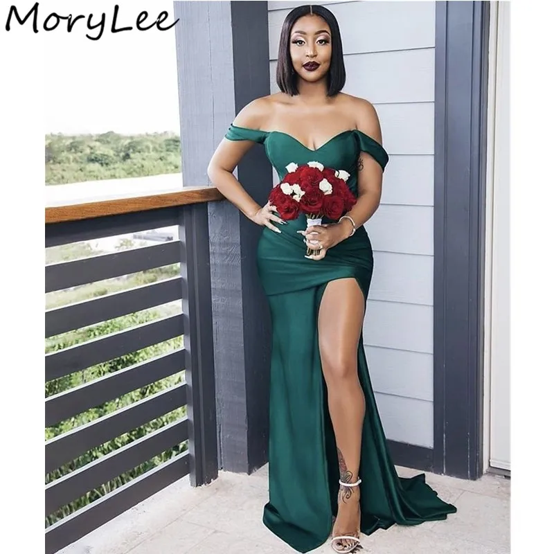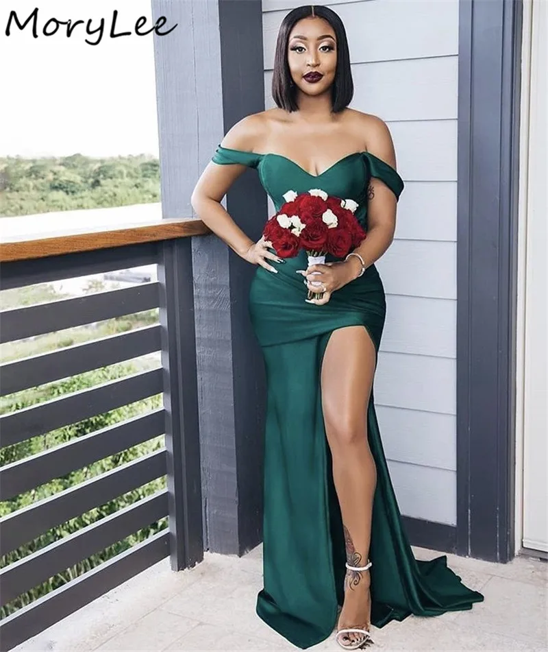 Модные платья подружек невесты, африканские платья с открытыми плечами и шлейфом, с разрезом по бокам, шелковые атласные Плиссированные Свадебные платья подружек невесты