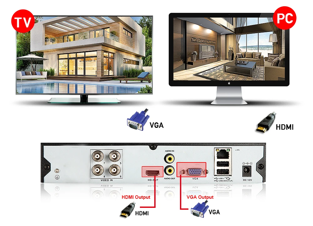 Просмотр на мониторе HDMl легко отображает видео через порт HDMI вашего монитора компьютера, чтобы в полной мере воспользоваться ясностью системы безопасности. (кабель HD не входит в комплект)Просмотр на телевизоре или мониторе ПК для дополнительного удобства, видеорегистратор также поставляется с подключениями VGA и BNC для стандартных вариантов просмотра разрешения.(Кабель VGA или BNC к RCA не входит в комплект.)