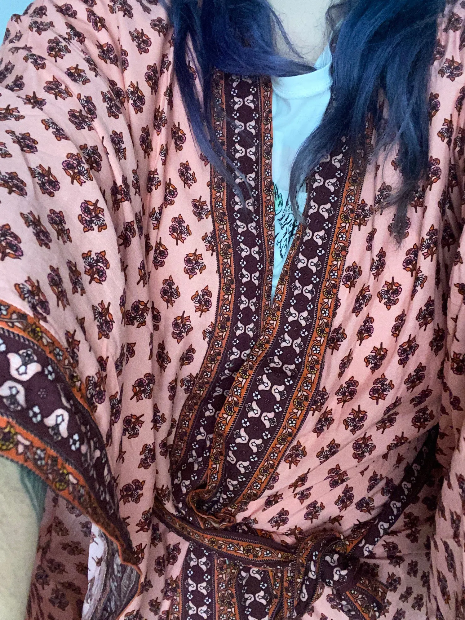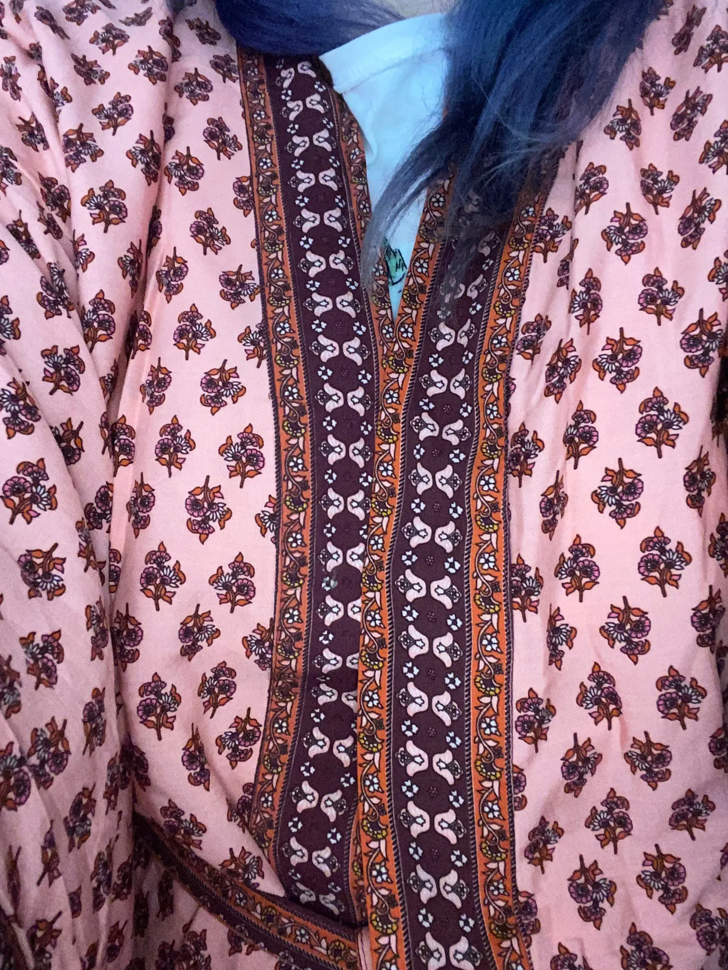 Заказывала, как домашний халат. Качество приятное, ткань натуральная. Совпадает с фото полностью, яркий и четкий рисунок. На 46 российский брала L, хотелось свободный, но сел , как М.