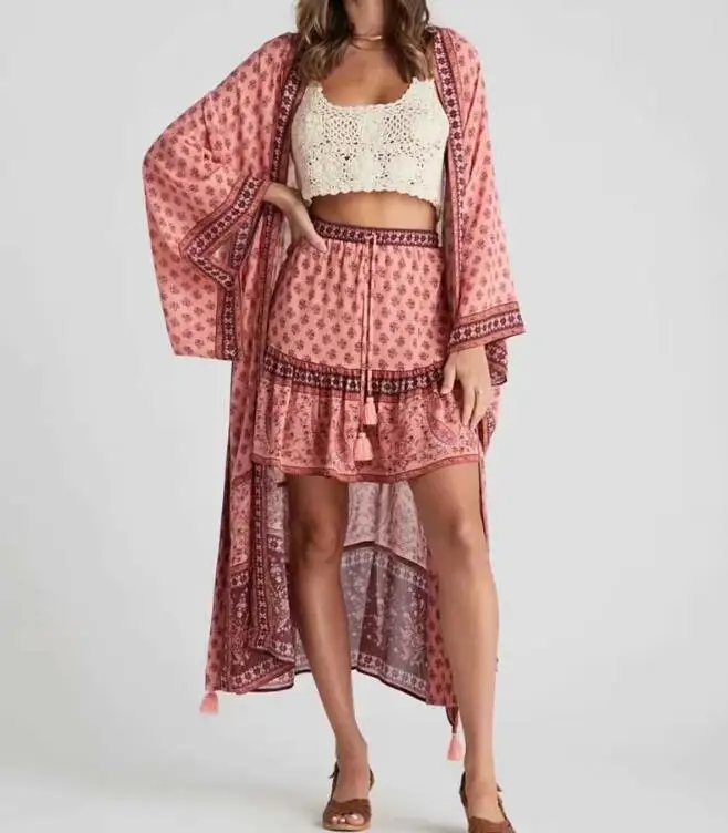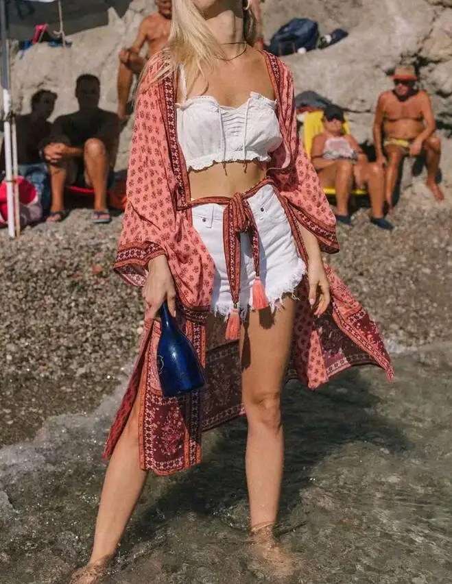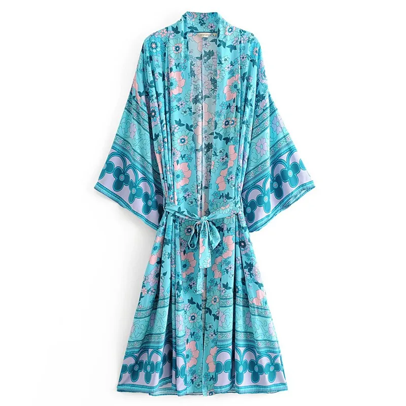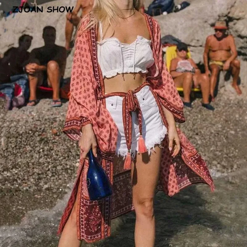 Женская Длинная блузка-кимоно, Пляжная рубашка макси с цветочным принтом, с рукавом летучая мышь, для отдыха, 2020