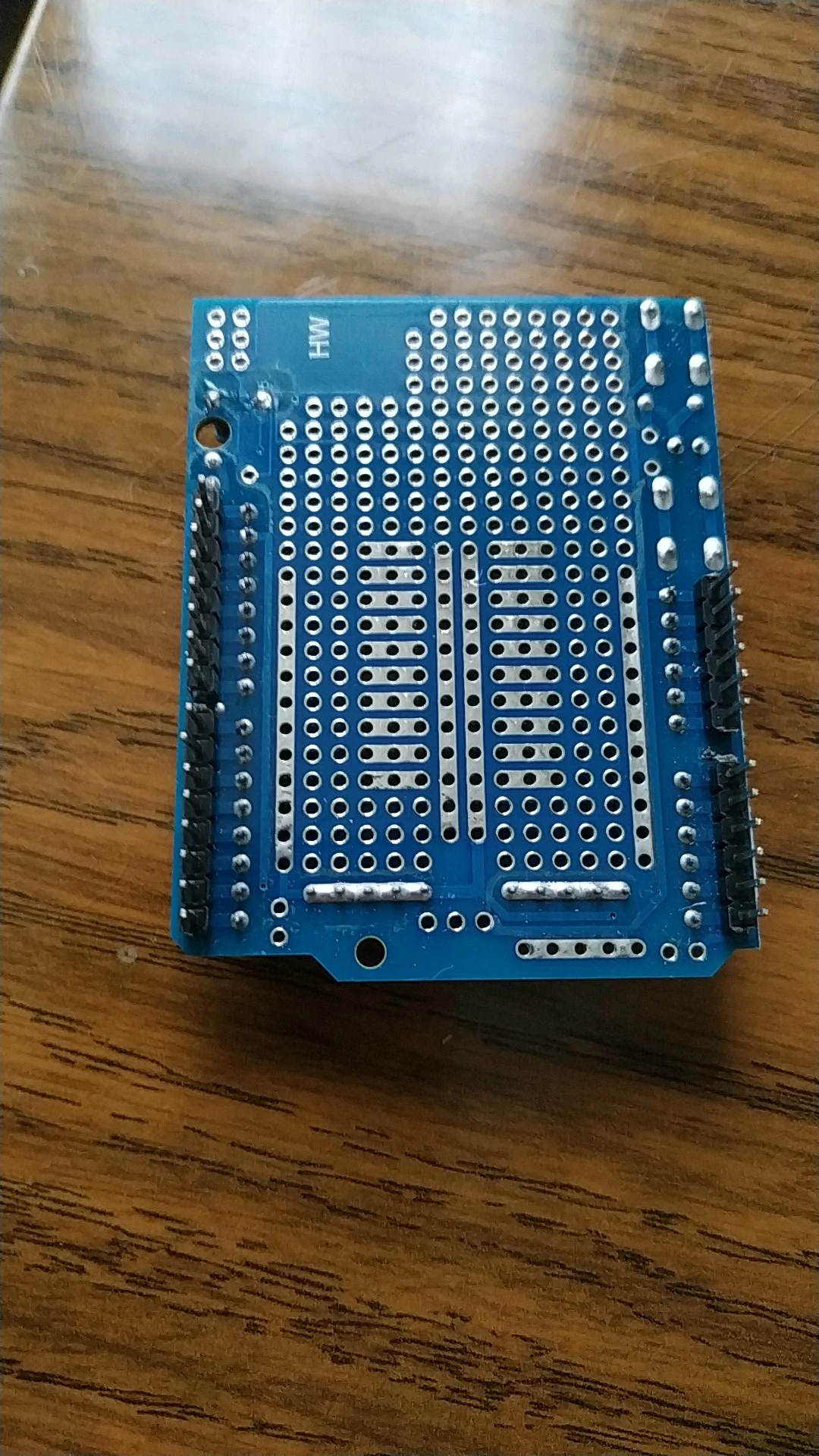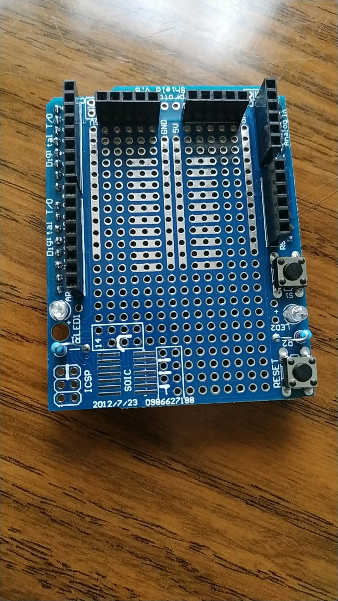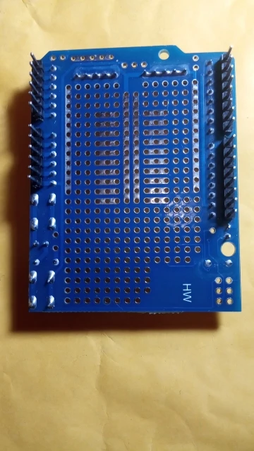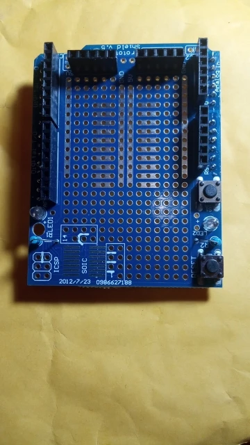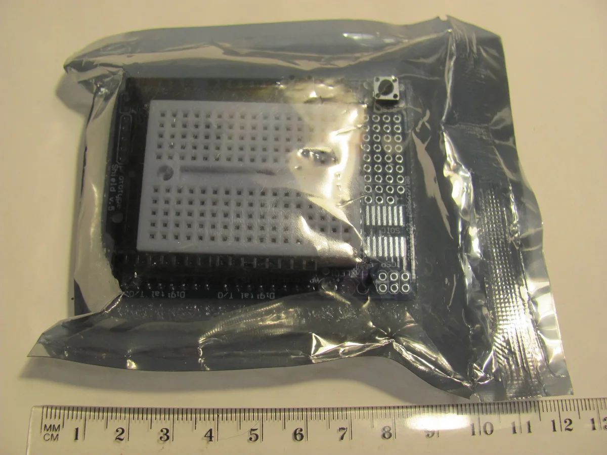 Слава Ктулху, приехала через 2 месяца. Отверстия и метализация аккуратные, лудятся и паяются легко. Есть подписи на плате, хотя я не понял, что могут делать светодиод и кнопка №2, если они подключены последовательно. Есть как одиночные отверстия, как в простых макетках, так и группы по 3 для установки микросхем до DIP20, так и несколько выводов в ряд чисто для земли или питания. Даже место под мелкий керамический конденсатор между VCC и GND есть. Распаял схемку МГТФ-соплями, командую с ардуиновского терминала, радуюсь)
