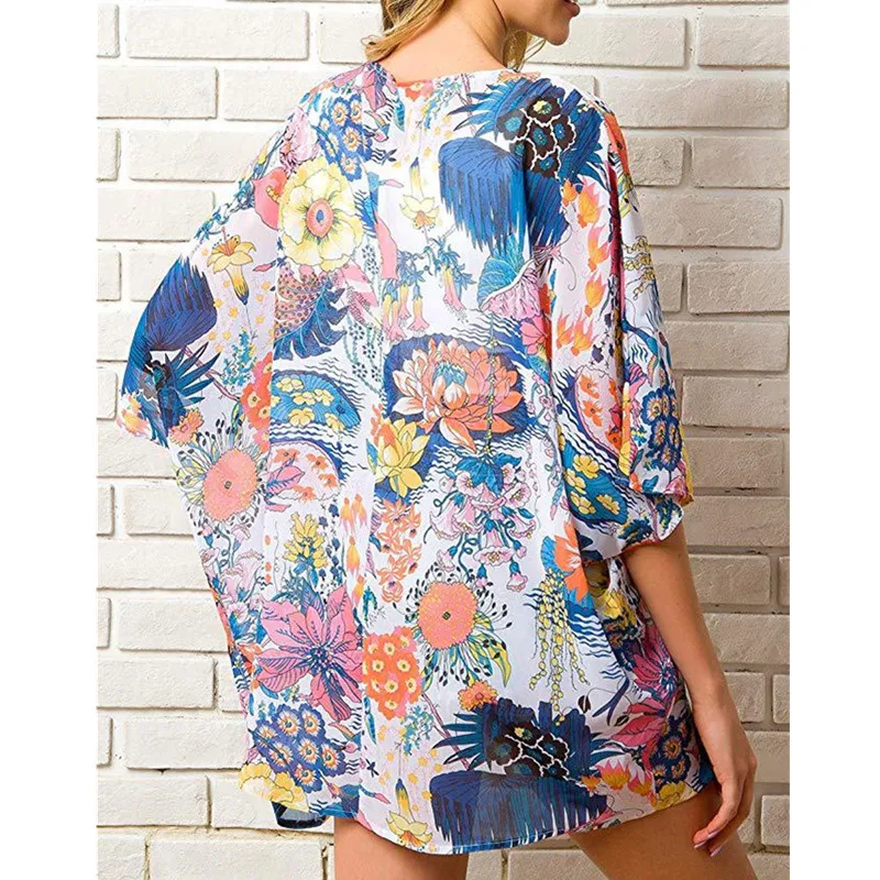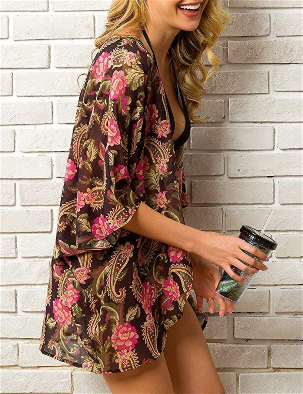 Женская пикантная накидка на купальник, бикини, кафтан, шифоновая накидка, пляжная одежда, парео, пляжные туники, шаль, кардиган, летняя накидка с цветочным принтом