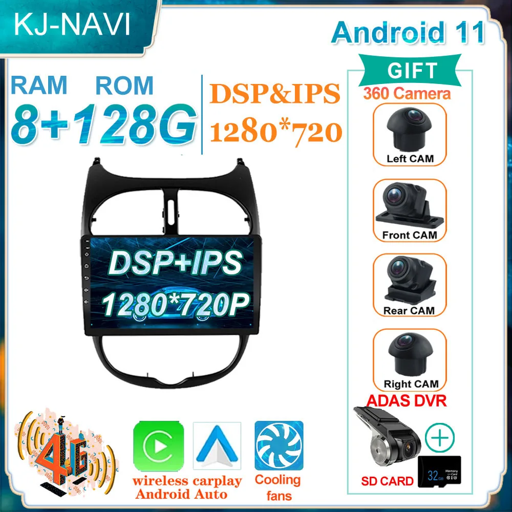 Автомобильный мультимедийный плеер с Bluetooth, радио, Wi-Fi, 4G, LTE, 8 +, 128 ГГц, для Peugeot 206, 2000-2016, Android 11, 2Din, без DVD