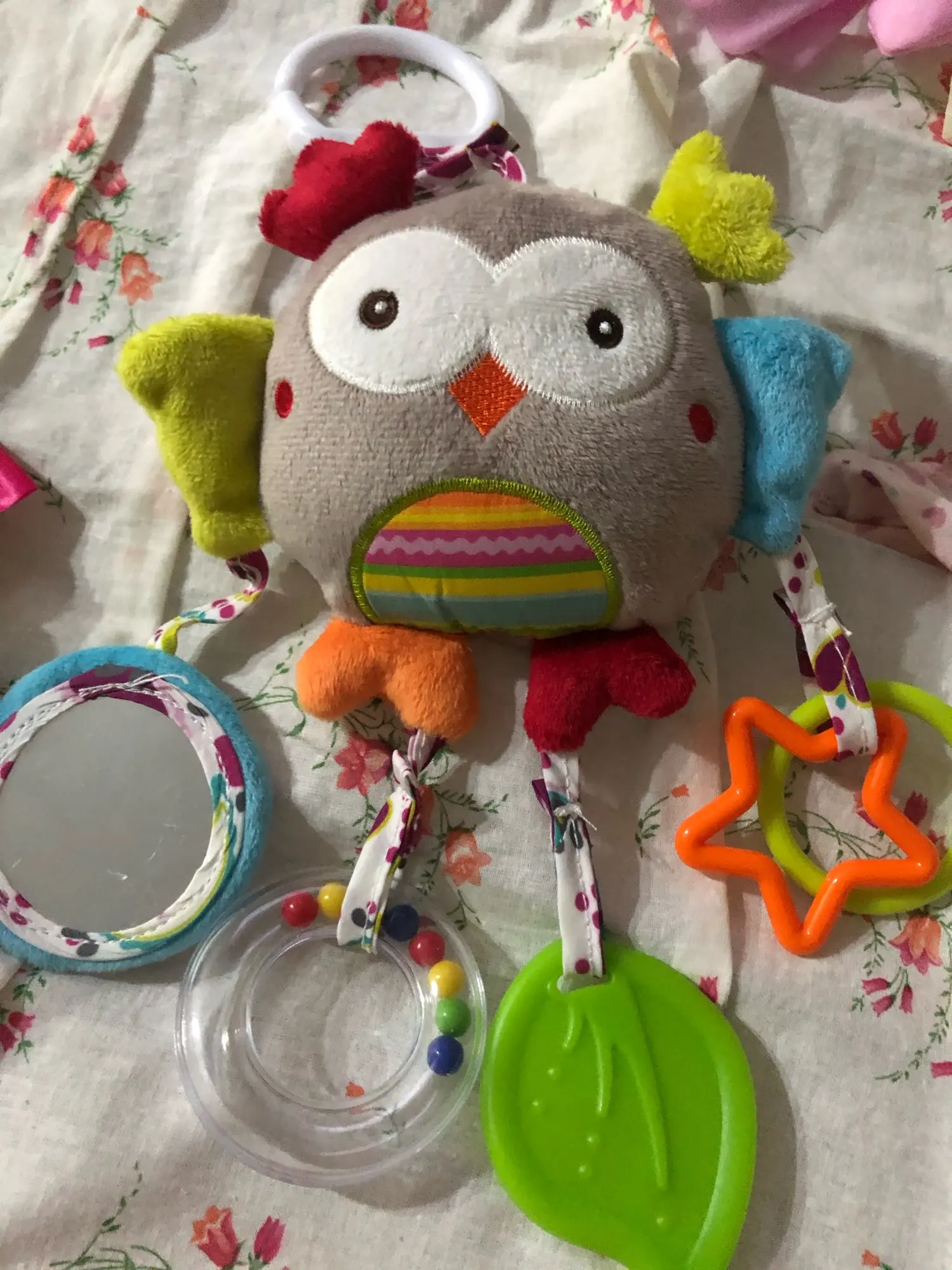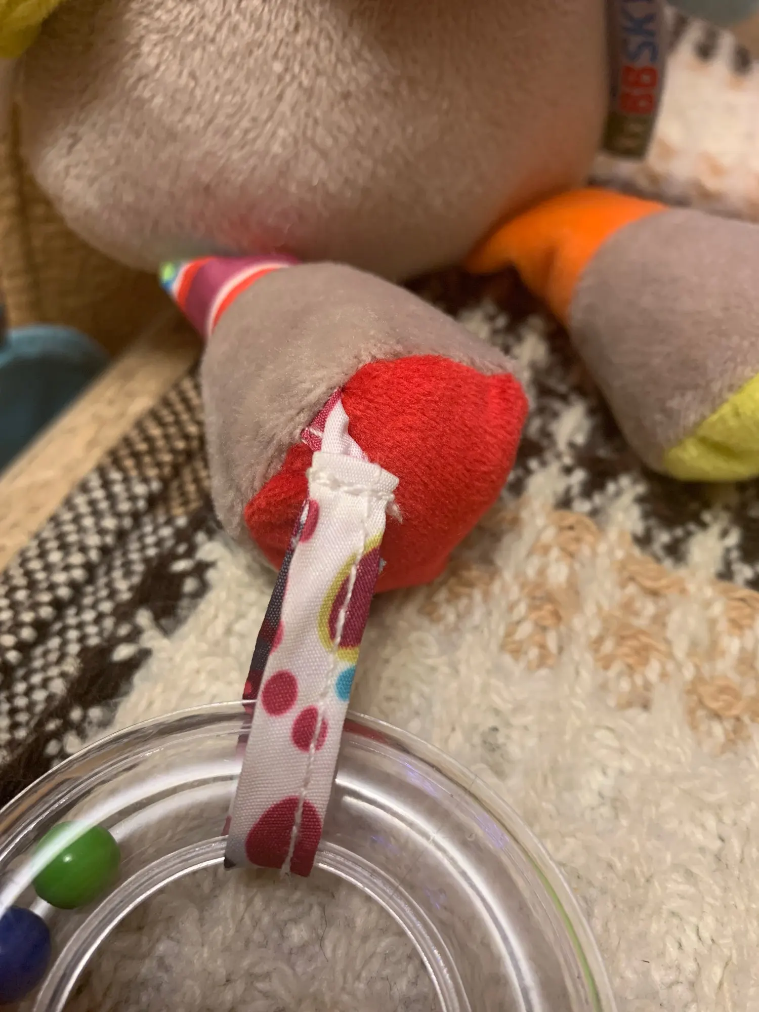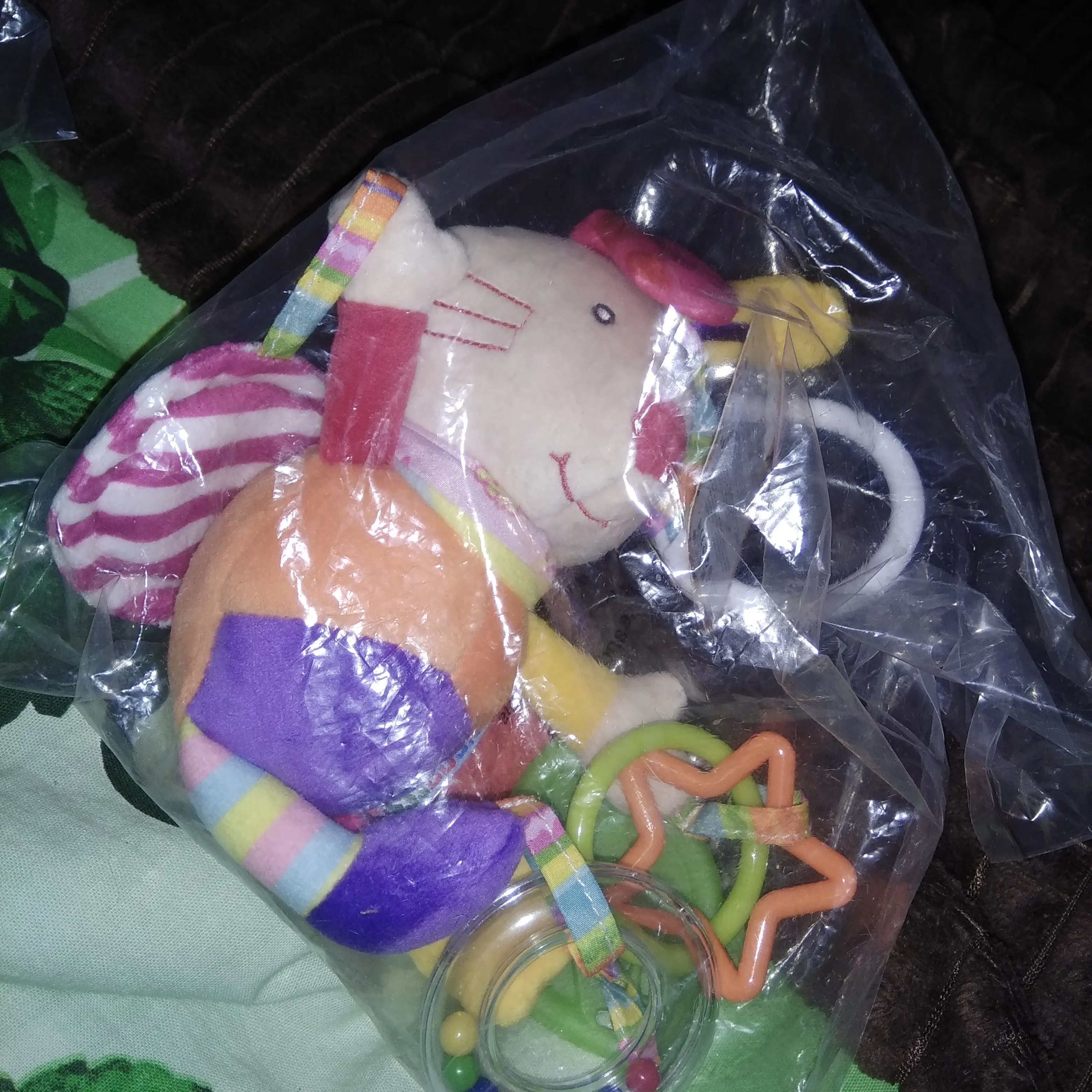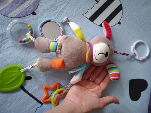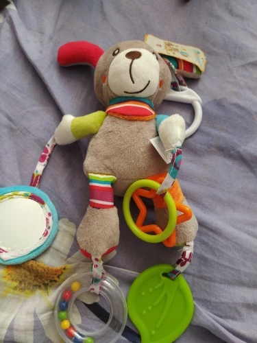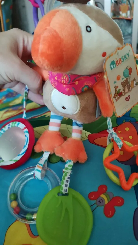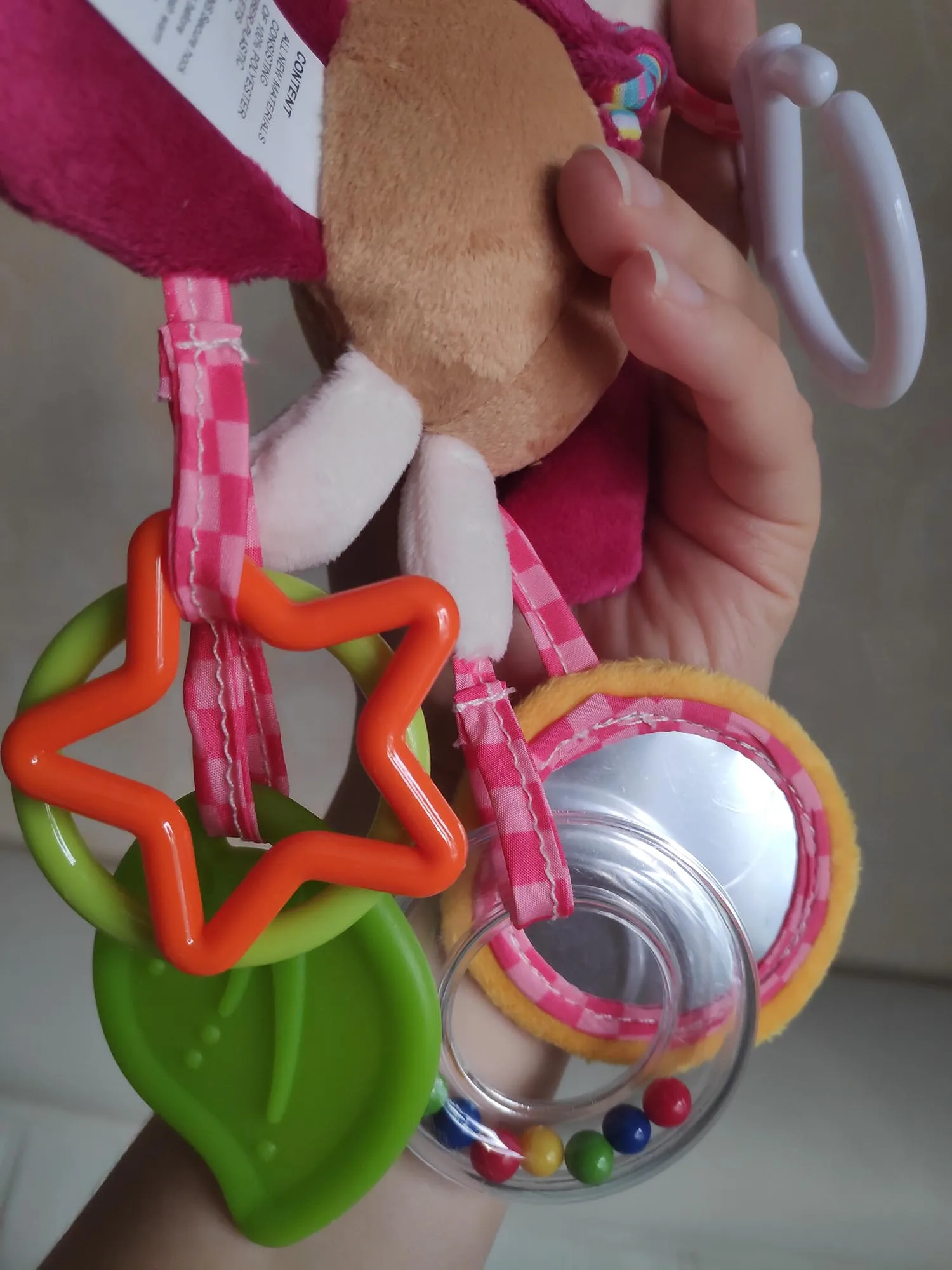 Заказ пришёл быстро, менее, чем за 3 недели. Одна из самых быстрых доставок в последнее время. Игрушка симпатичная, яркая, не маленькая.Можно стирать, о чем есть информация на ярлычке.Всё, как в описании.В магазинах подобные стоят дороже. Не понравилось зеркальце, совсем мутная поверхность непонятного материала. И не очень понимаю смысл такого крепления