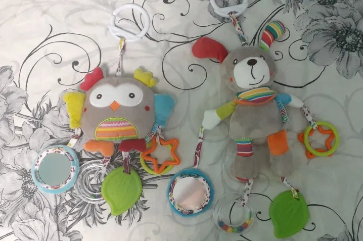 Доставка 2 недели в МО до почты. Прикольные игрушки, детям очень понравились! Можно повесить и в кроватку, и на мобиль, и на ручку автокресла-люльки, и на развивающий коврик прицепить. Детям не надоедает пока, погремушка не очень громкая, приятная. Очень рекомендую!