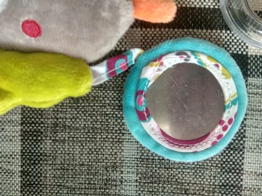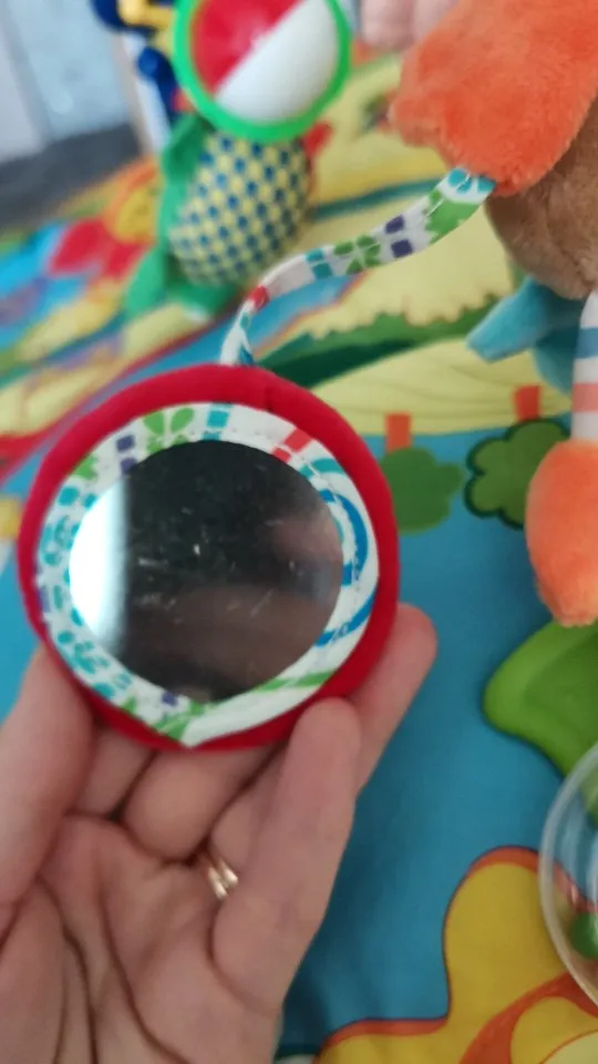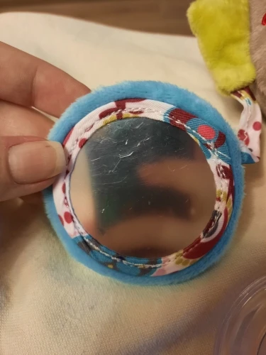 Пришел с браком, дубль подвески из колечка и звёздочки вместо листика-прорезователя, за что продавец моментально вернул часть денег. "Зеркальце" безопасное, не стекло, а фольга под пластиком (или типо того), поэтому соответственно мутное, не отражает, а просто приломляет свет. Сама игрушка очень качественная!