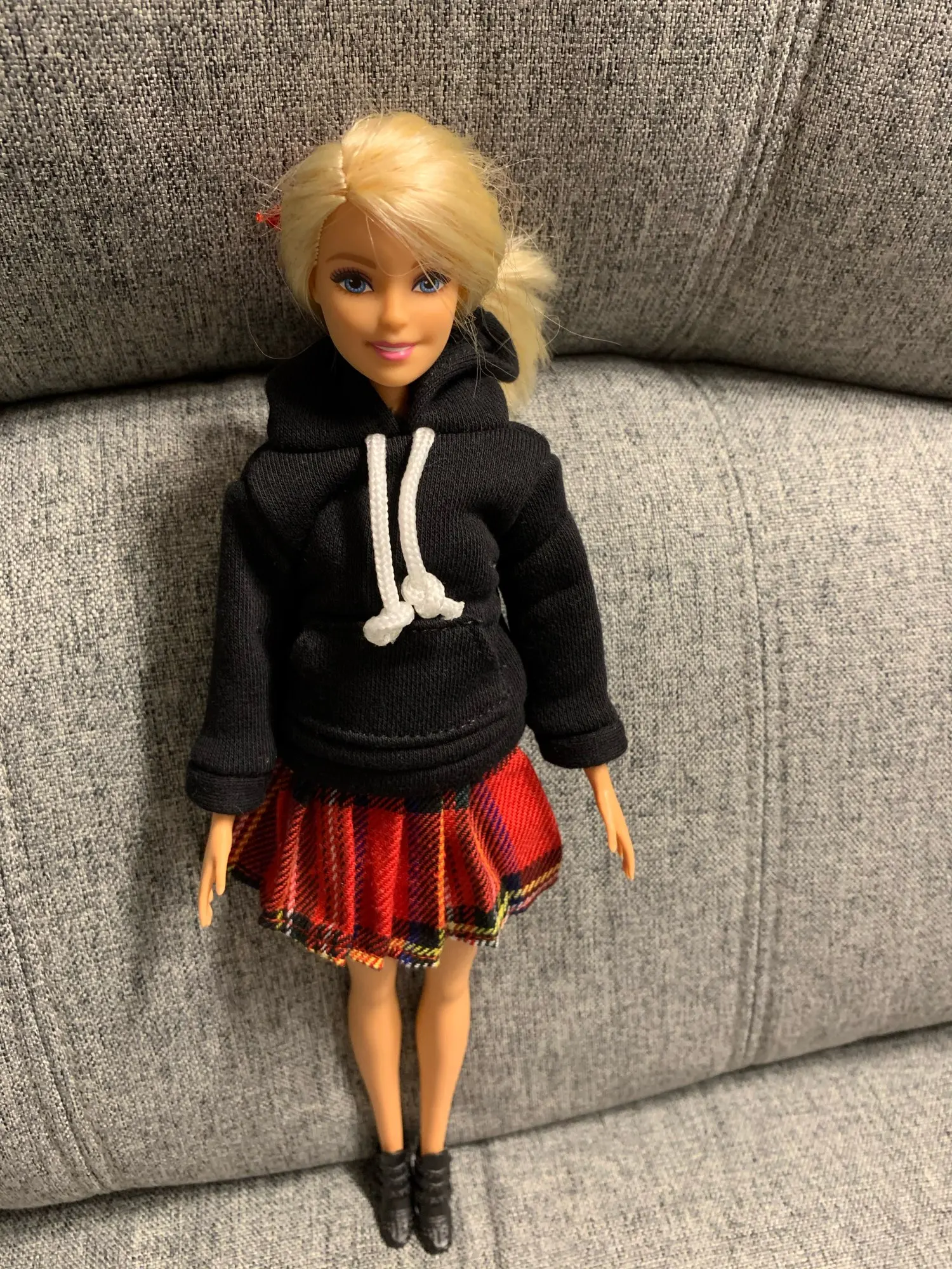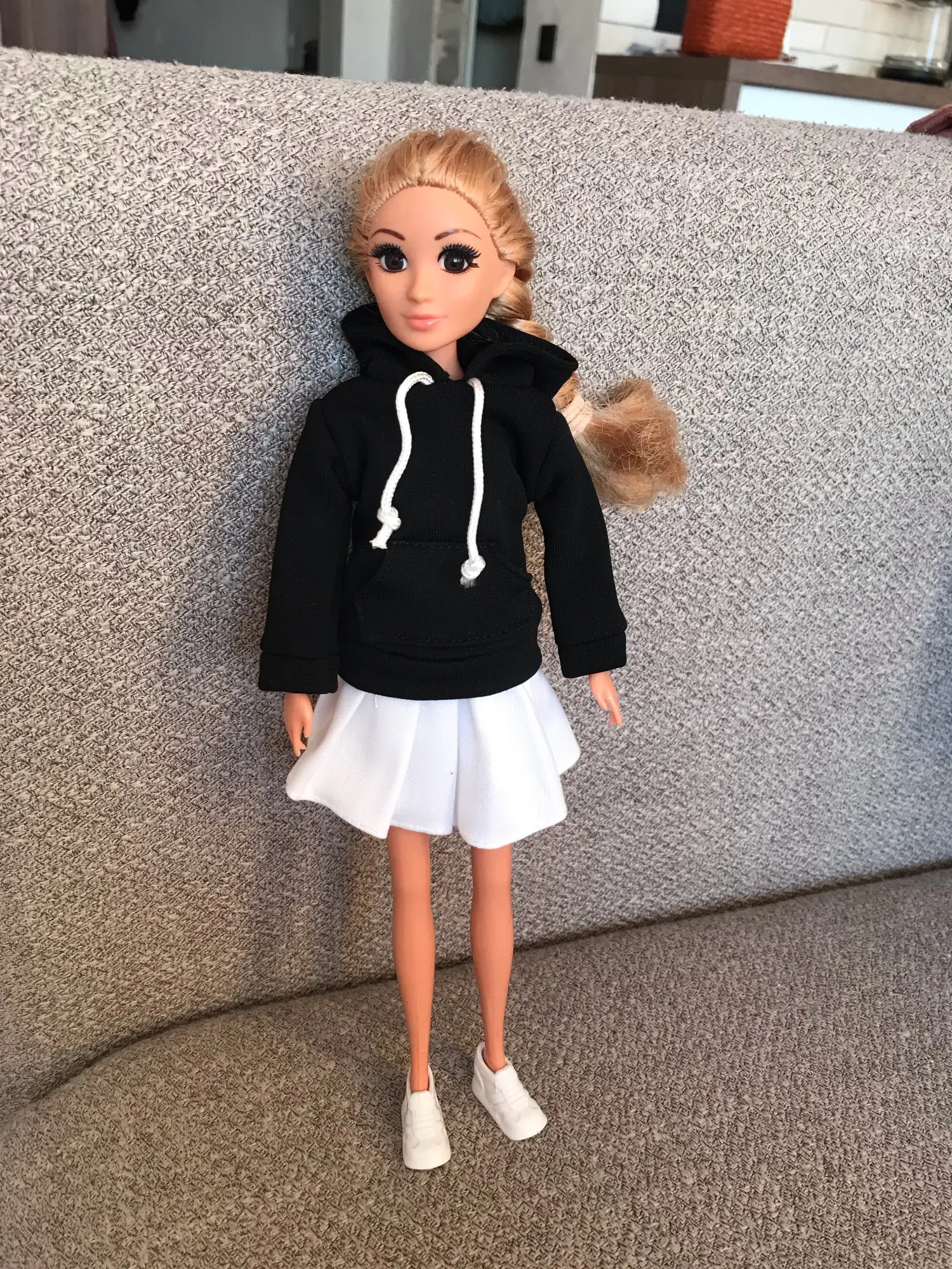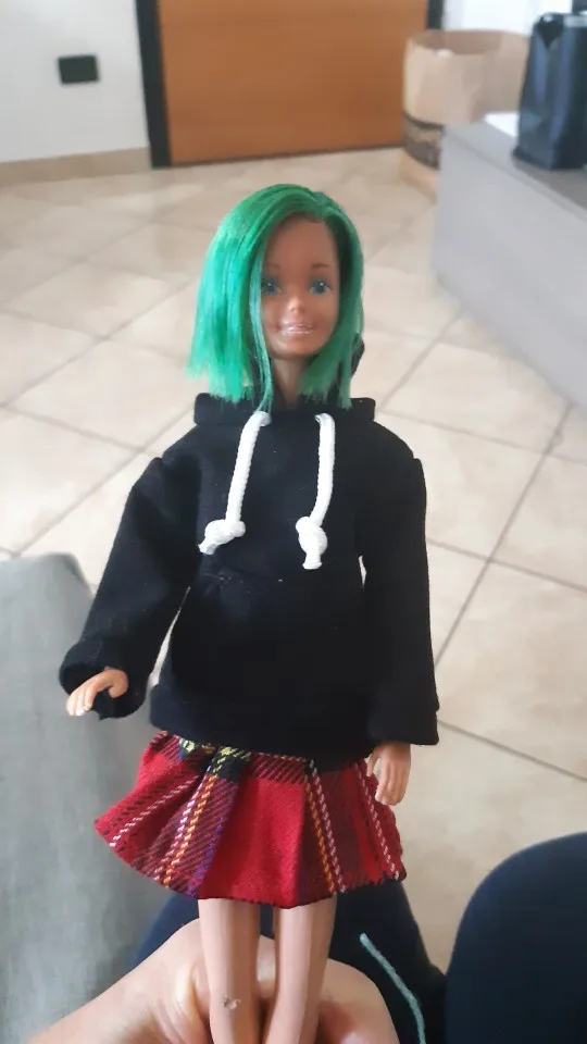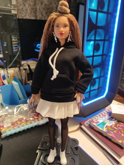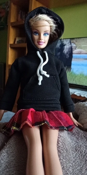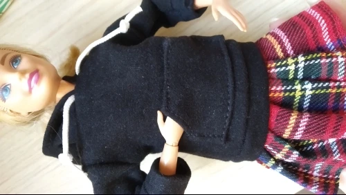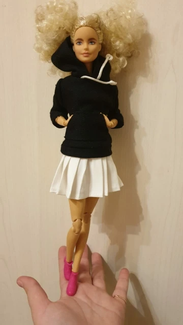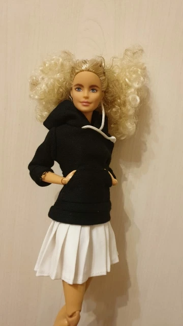 Худи отличная, подошла по размеру на Барби, качественная, сзади на липучке. А юбка оказалась маленькая в талии, липучка до конца не застегивается.