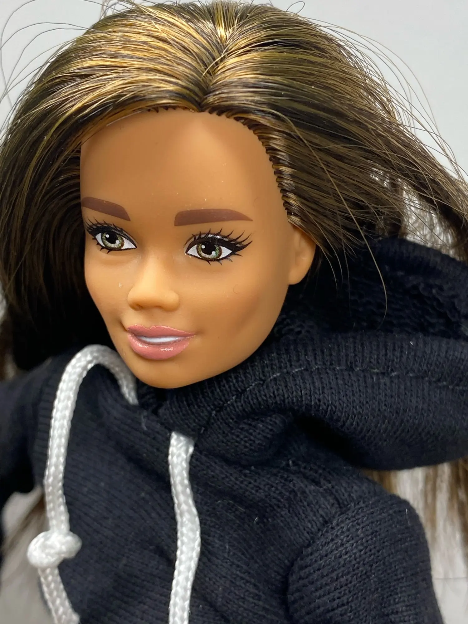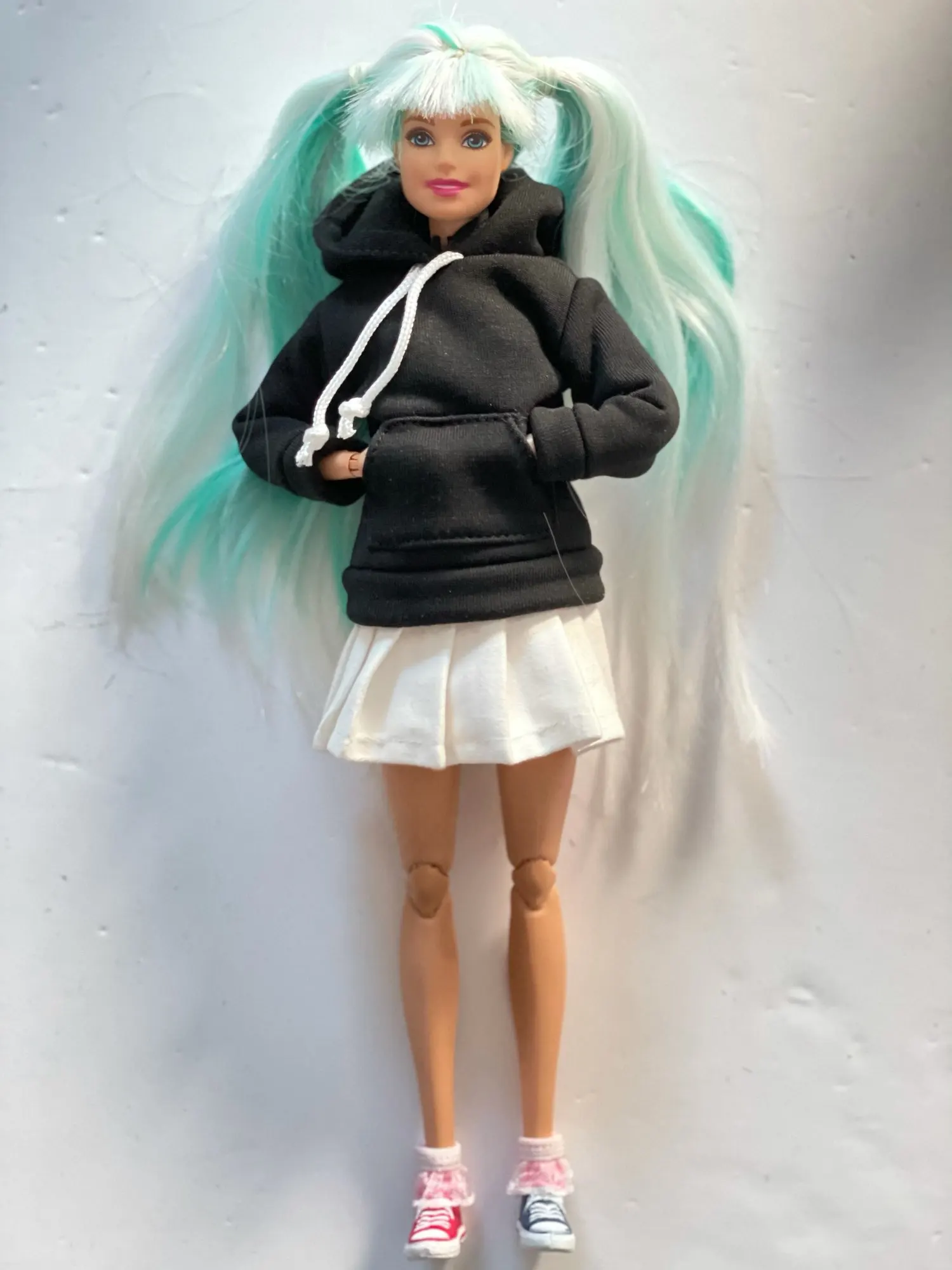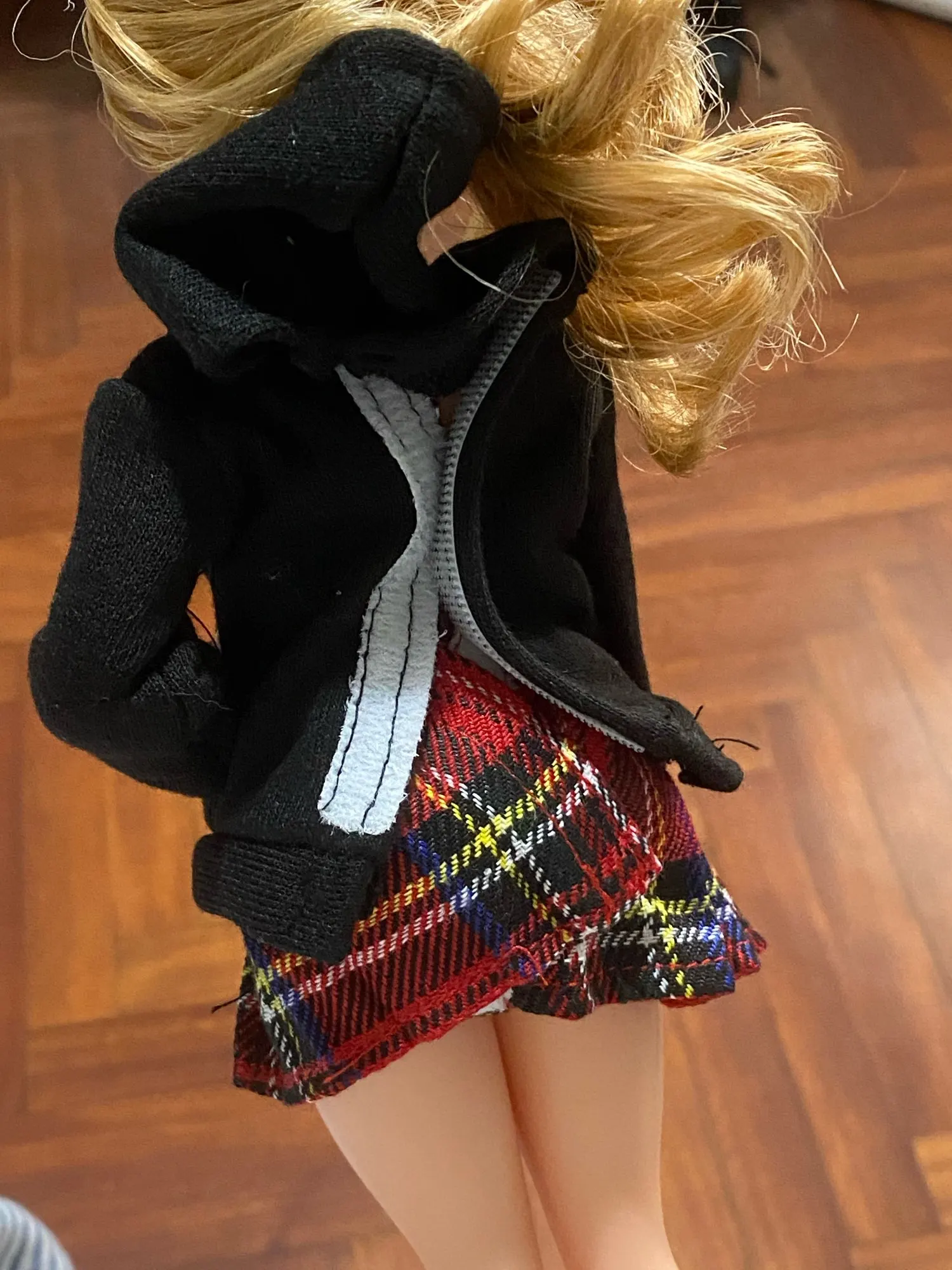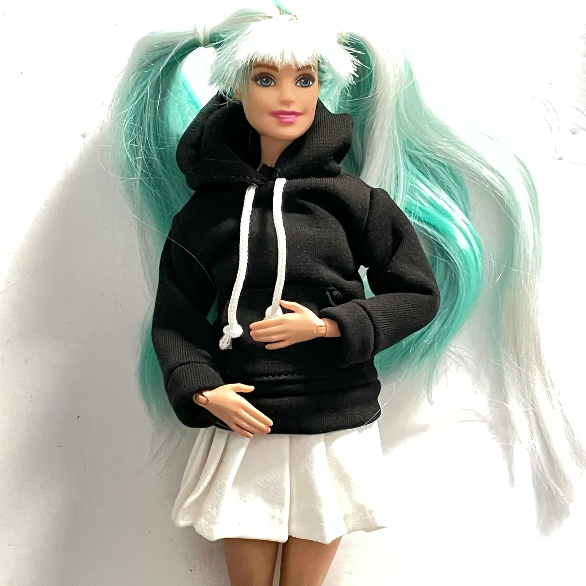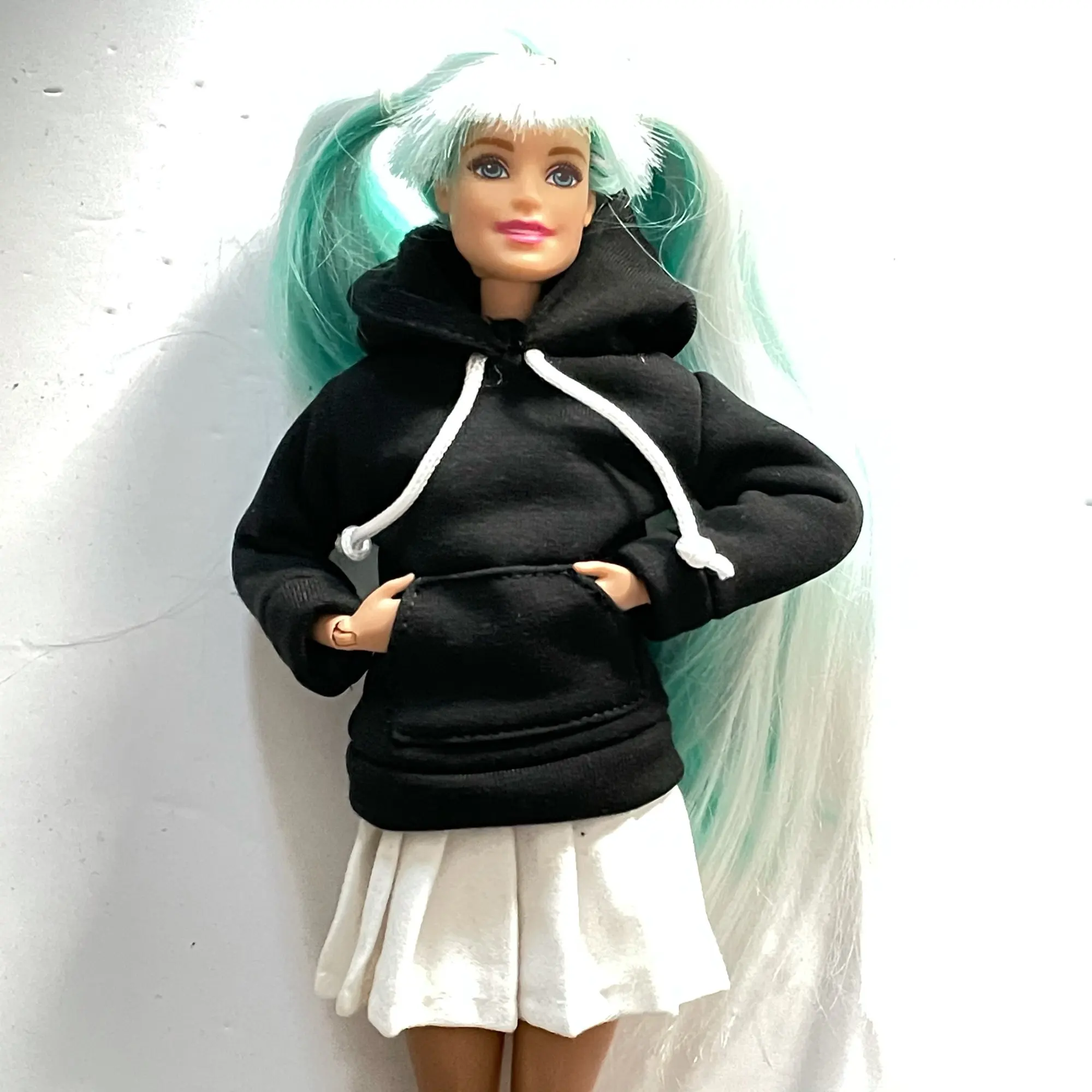 очень аккуратно и красиво сшито. юбка объемная, длинная, на Барби от талии до середины бедра, размер на стандартную Барби идеальный. ткань супер, грубая, хорошо держит объем, настоящая костюмная. толстовка со всеми деталями - карман "кенгуру", манжеты, шнурки. под капюшоном есть липучка- застёжка. очень симпатичная.
