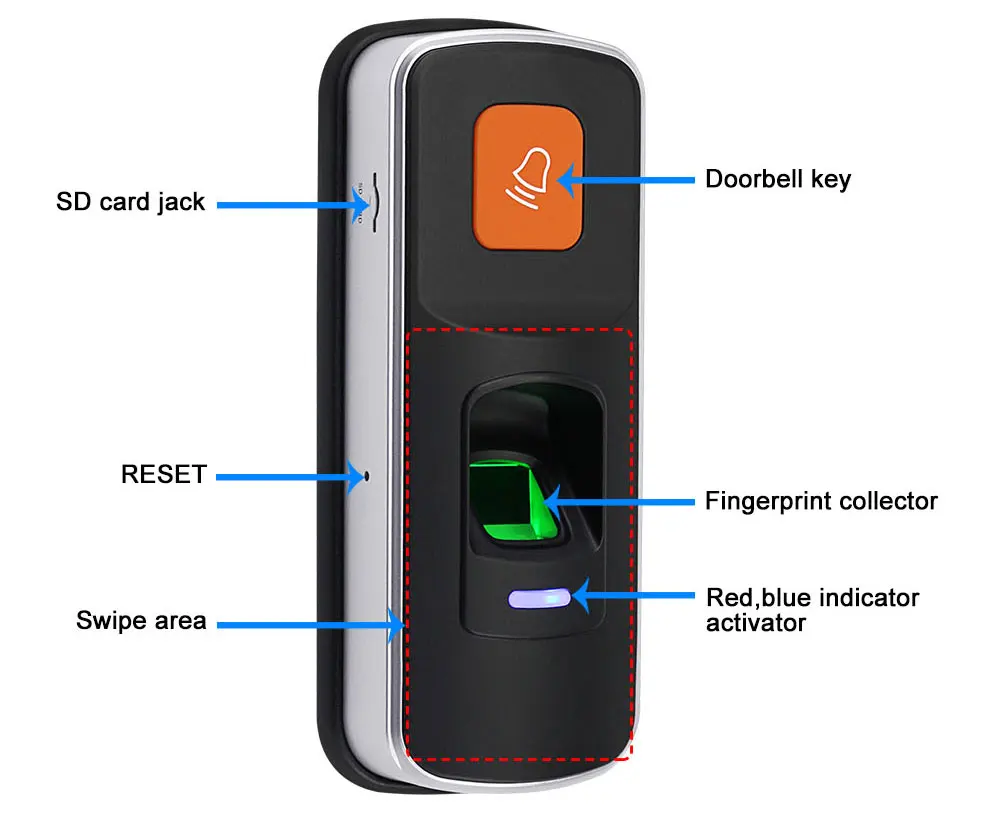Поддержка 1000 отпечатков пальцев, 1000 карт памяти пользователя, имеет кнопку дверного звонка для более удобного использования.