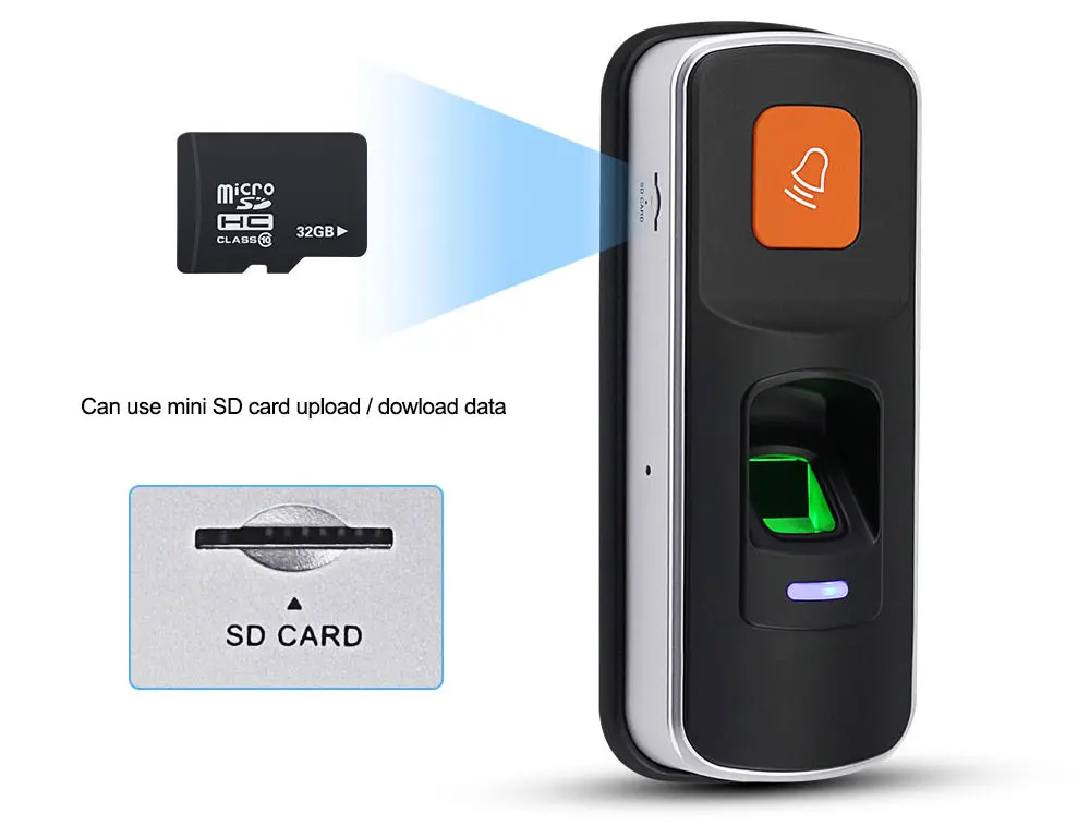 Можно загрузить все посадочные данные на SD карту, поиск более удобный и быстрый. SD-карта памяти может использоваться для загрузки, загрузки, входа в систему, вы можете редактировать и называть пользователя напрямую. Загрузите на устройство отпечатков пальцев еще раз, но не Удалите пользователя и добавьте пользователя напрямую. (Добавить/удалить пользователь должен использовать карту управления или отпечаток пальца.)Внимание: поддерживает SD-карту 32G. Но мы не оснащаем это устройство SD-картой. Вы должны купить SD-карту дополнительно.