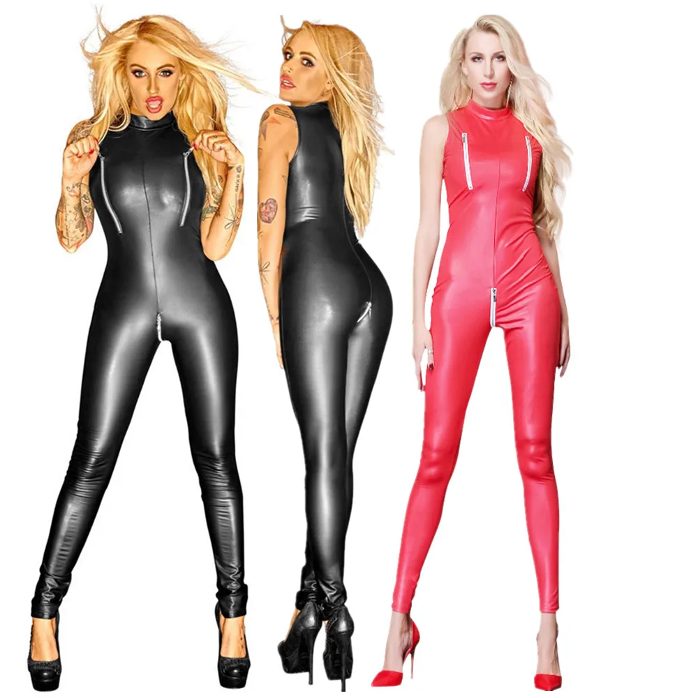 Черно-красный комбинезон из искусственной кожи на молнии с мокрым внешним видом, ПВХ латексный костюм кошки, Клубные костюмы, сексуальные женские костюмы, фетиш