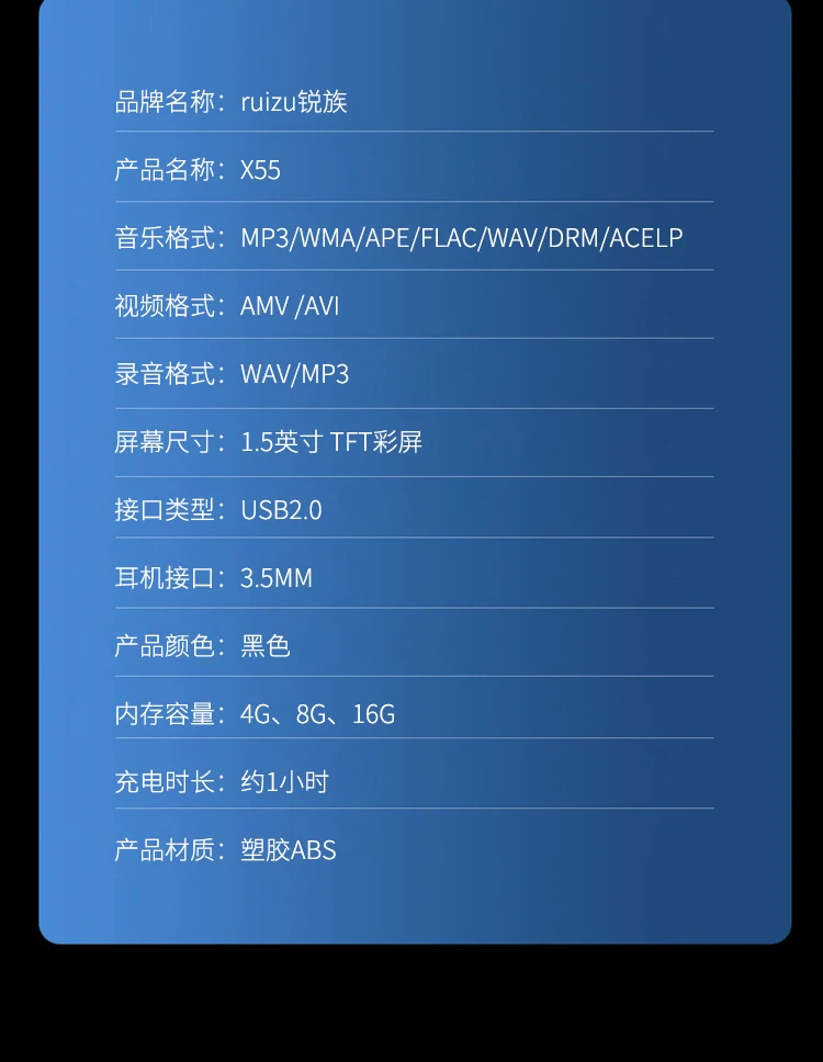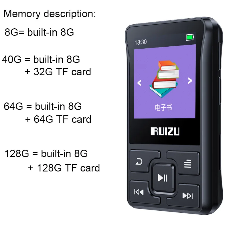 Описание памяти: 8G = встроенный 8G 40 ГБ = Встроенная TF-карта 8 ГБ + 32 ГБ 64 ГБ = Встроенная TF-карта 8 ГБ + 64 ГБ 128 ГБ = Встроенная TF-карта 8 ГБ + 128 ГБ Дисплей: 1,5 дюйма Разрешение экрана: 160*128 Память: 8 Гб Воспроизведение фона музыки: Поддержка Синхронизация текстов LRC: Поддержка A-B Повтор: Поддержка Режим воспроизведения: повторное воспроизведение, одиночное воспроизведение, все циклы Функция TF-карты: Поддержка карт памяти макс. 128 ГБ Воспроизведение с переменной скоростью: 16 смещений Видео: Поддержка видео в формате AVI. Перед воспроизведением обычного видео необходимо преобразовать с помощью видеоконвертера. Мы предоставим видеоконвертер. Громкоговоритель: Поддержка Функция Радио: поддержка Будильник: поддержка Секундомер: Поддержка Чтение текста: Формат TXT, поддержка закладок Аккумулятор: полимерный аккумулятор 300 мА Функция записи: Поддержка записи с микрофона Срок службы: 30-65 часов воспроизведения песен в состоянии заставки наушников. Видео воспроизводится 3-7 часов. Язык: поддержка 20 языков. Английский, русский, итальянский, иврит. Японский, корейский. Испанский. Немецкий и т. Д. Аудиоформат: APE, AAC, FLAC, MP3, WMA, OGG. Посылка: 1 mp3-плеер 1x проводные наушники 1 USB-кабель 1 Руководство пользователя