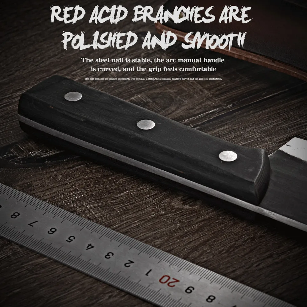 Материал лезвия: кованая Высокоуглеродистая сталь ручной работы Ручка: полностью встроенный Стальной хвостовик + дерево + заклепка Разбрызгивание закалки: 780 градусов Закалка: 180-200 градусов Процесс производства: закалка-зажим стали-закалка и другие операции непрерывного цикла.