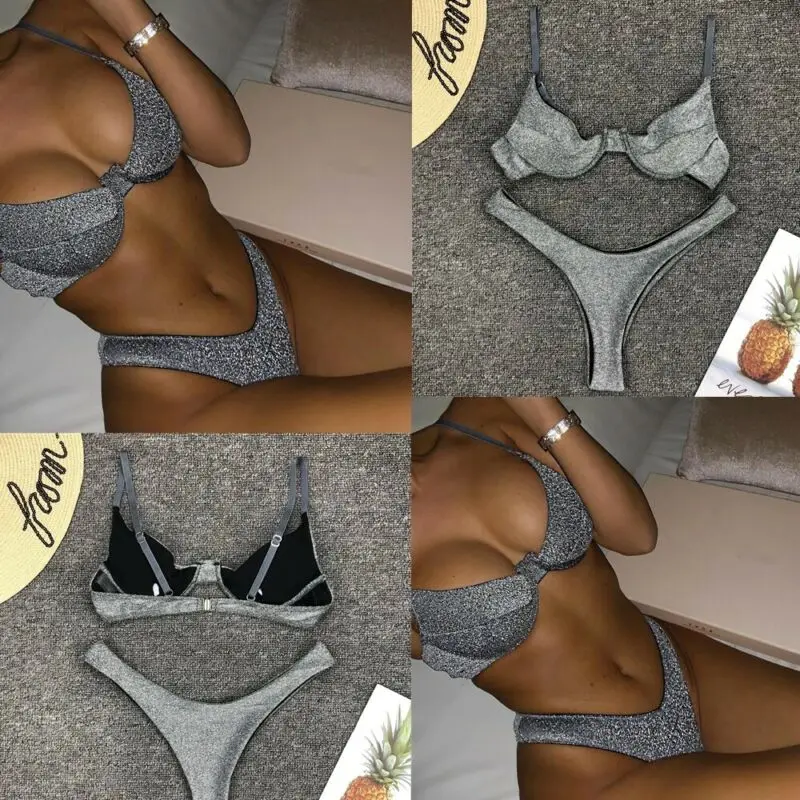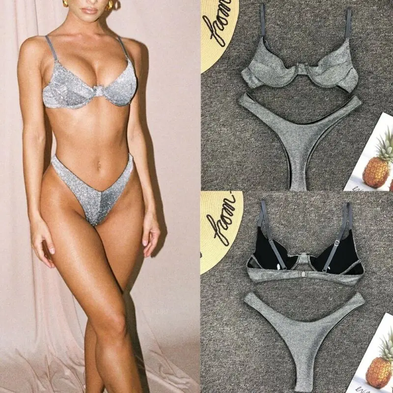 Однотонный женский блестящий комплект бикини из 2 предметов, купальник, сексуальный женский купальник с блестками, купальный костюм серебристого, розового, голубого цвета