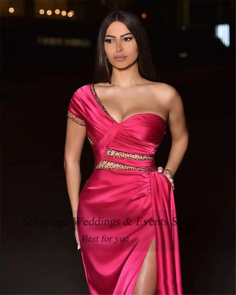 Платье на Одно Плечо Sevintage, длинное вечернее атласное плиссированное платье с одним открытым плечом, с разрезом, цвета фуксии, Дубай, для выпускного вечера