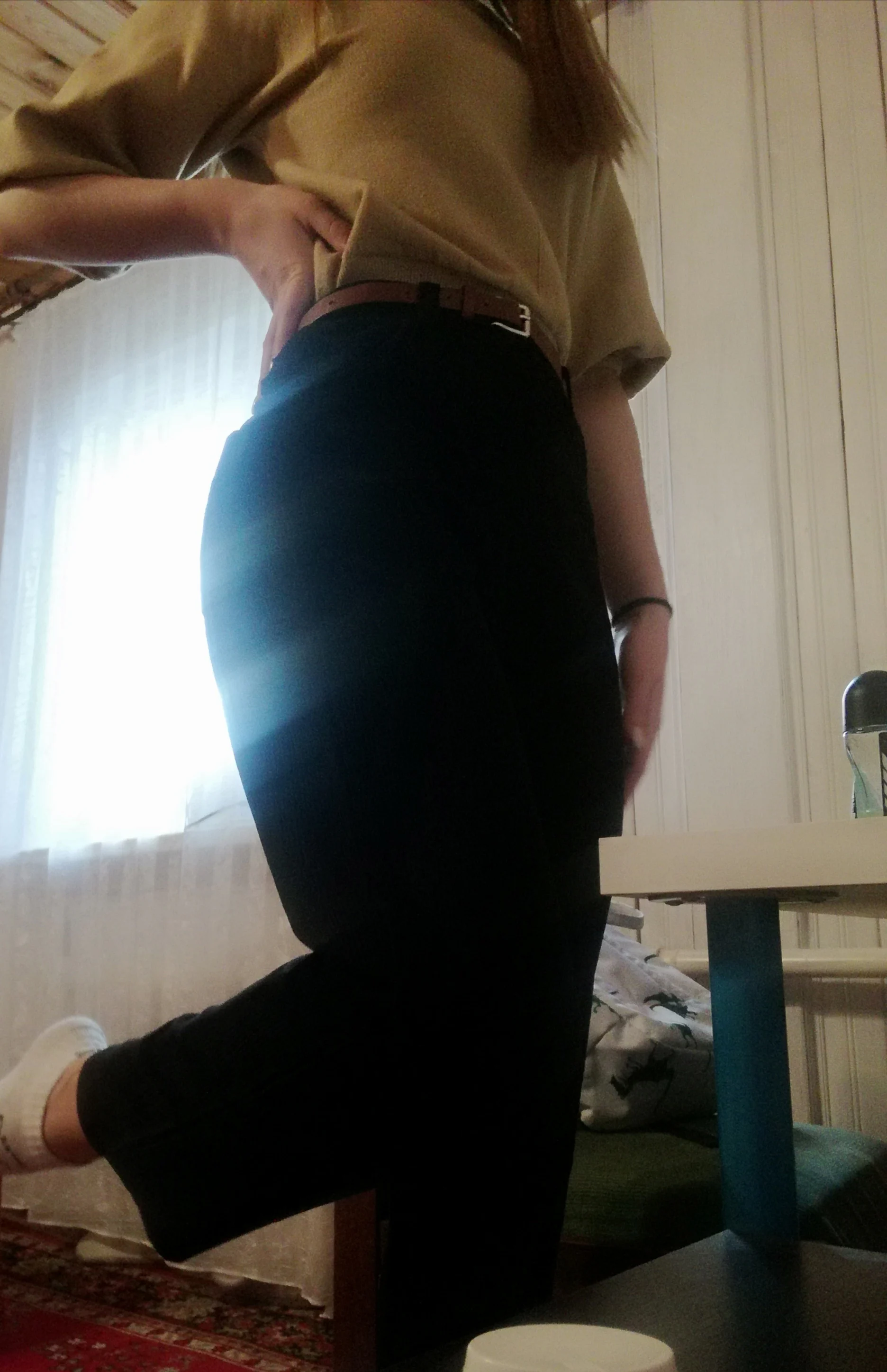 Брюки просто шикарные. Дошли всего за две недели, в комплекте был ремень и в подарок положили резинку для волос. Ткань не особо толстая, довольно холодная, но на теплую погоду подойдет. Брала на размер больше, но стоило все же брать свой, брюки не маломерят, но довольно длинные.
