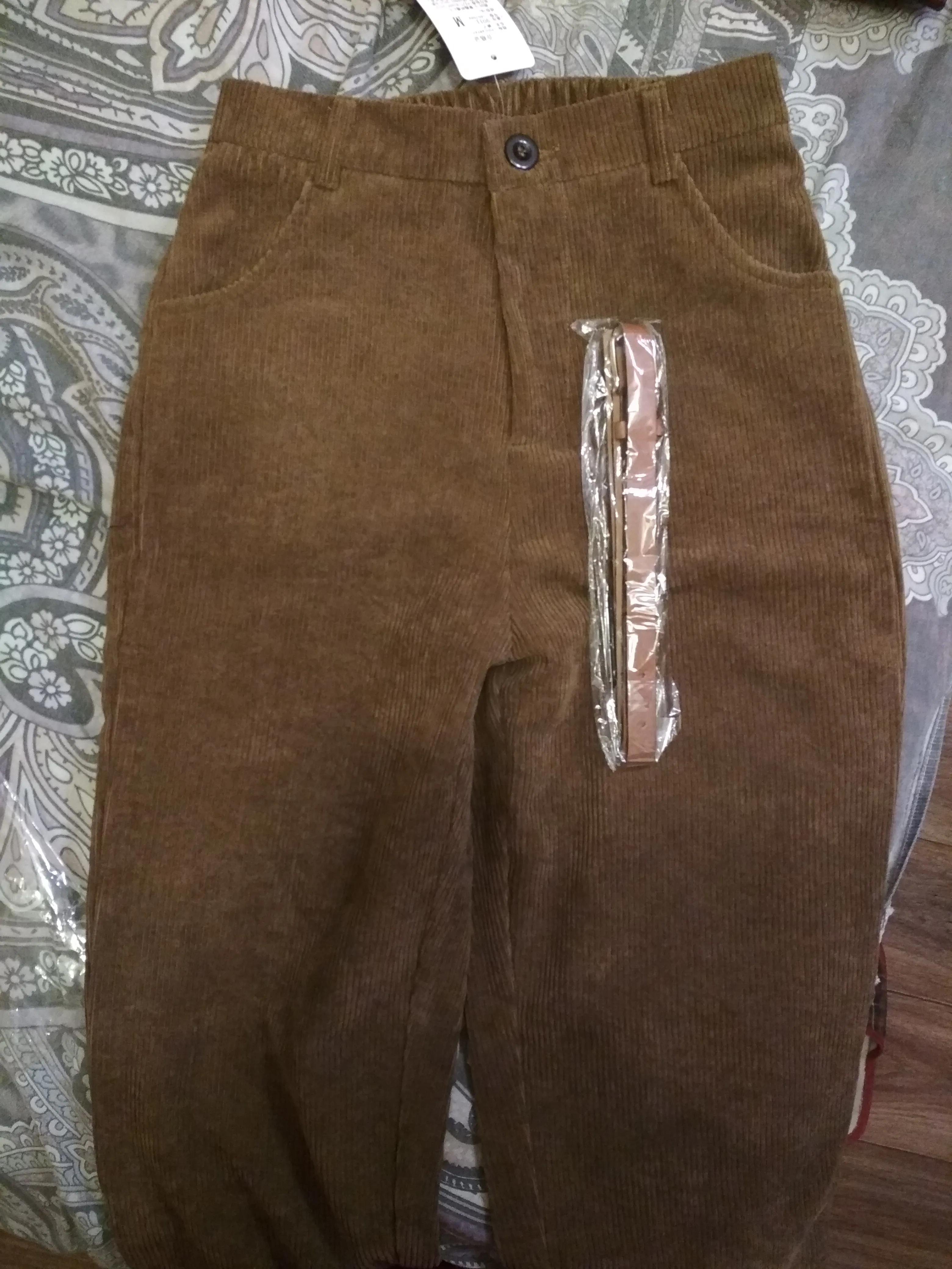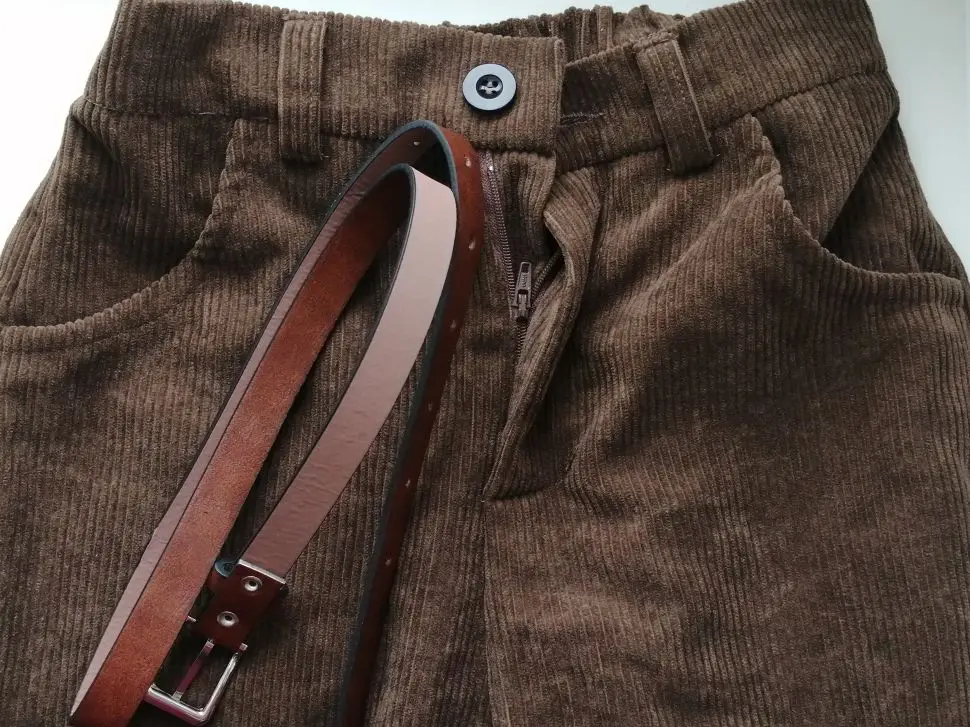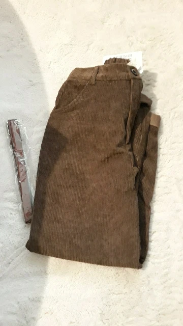 Здравствуйте. Получила штанишки. Мои параметры: 175 рост, ОТ 78 и ОБ 95. Заказала ХL - подошли, думаю, что и L тоже сядет хорошо. Я хотела посвободнее. Был пояс в комплекте (плохого качества) и резинка для волос. Это не вельвет, но очень похоже. Спасибо.