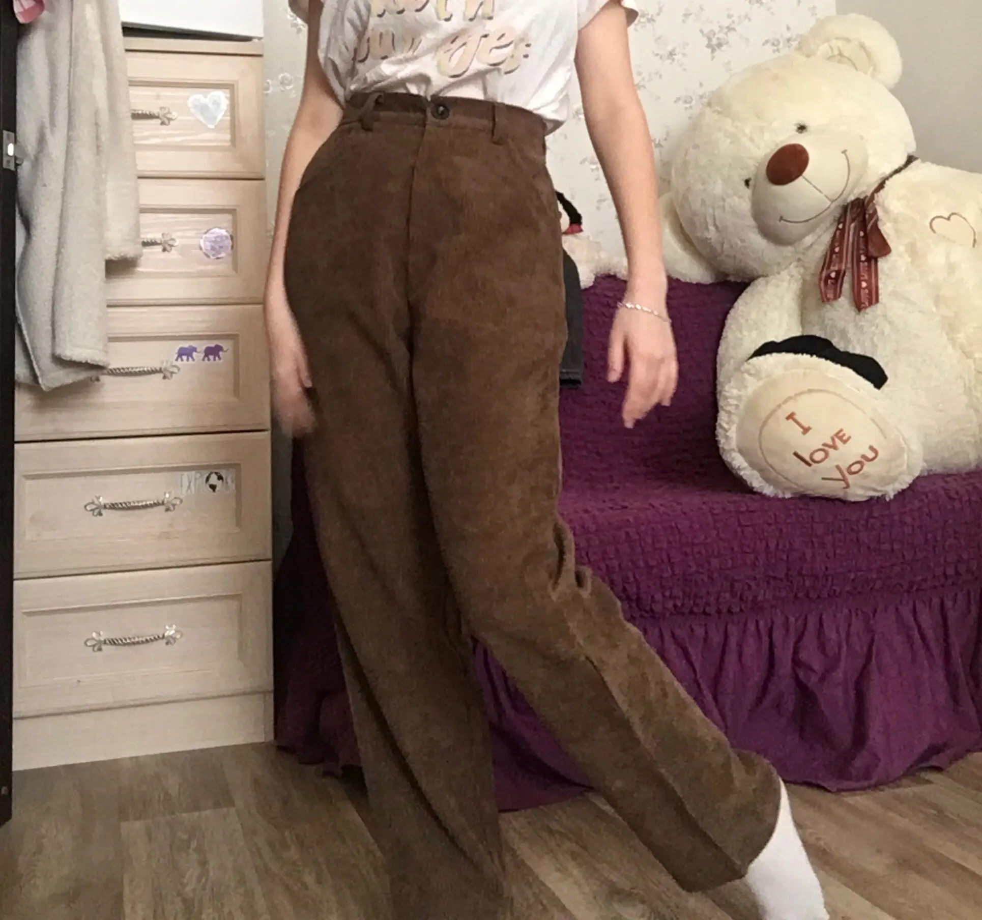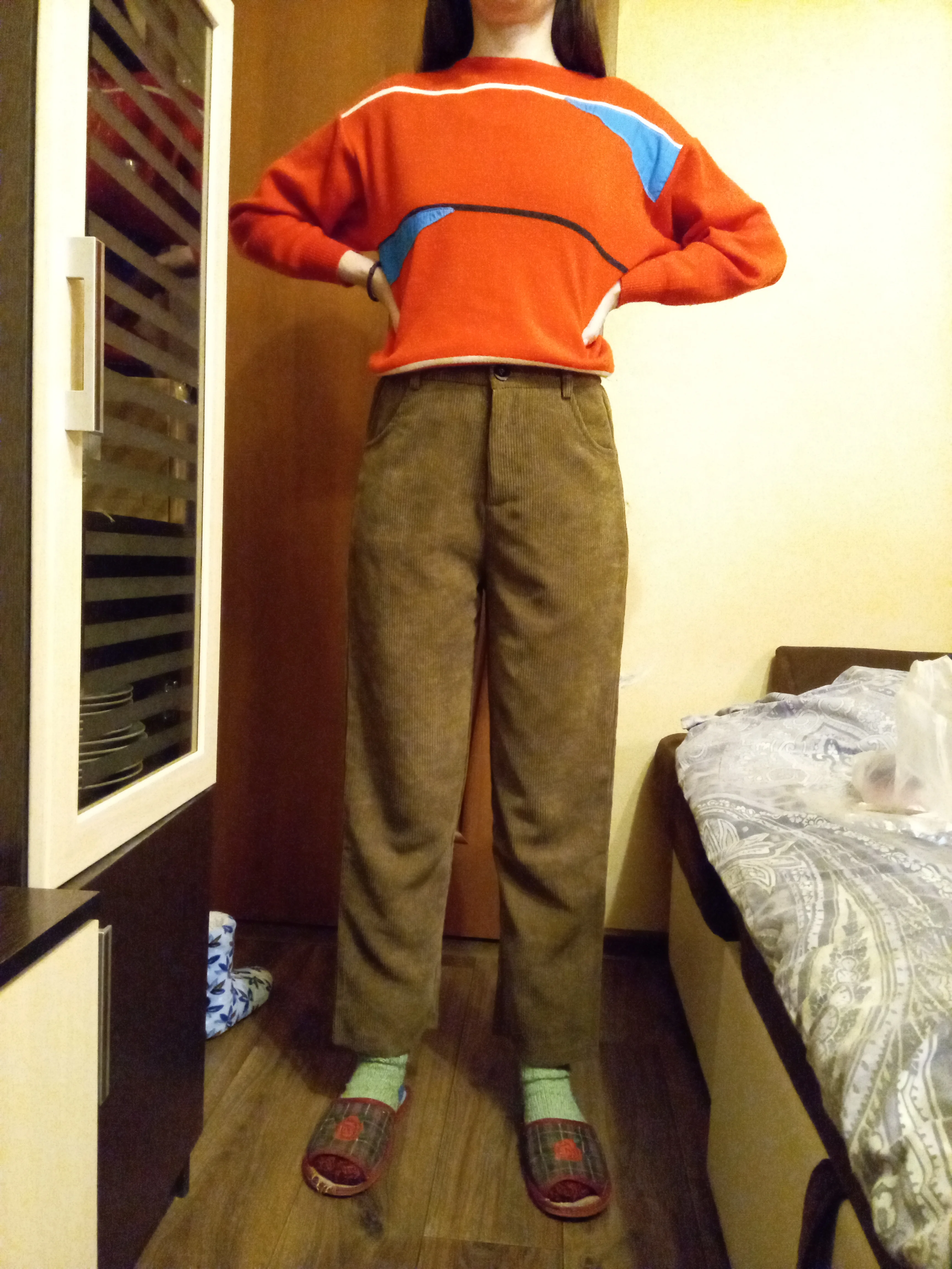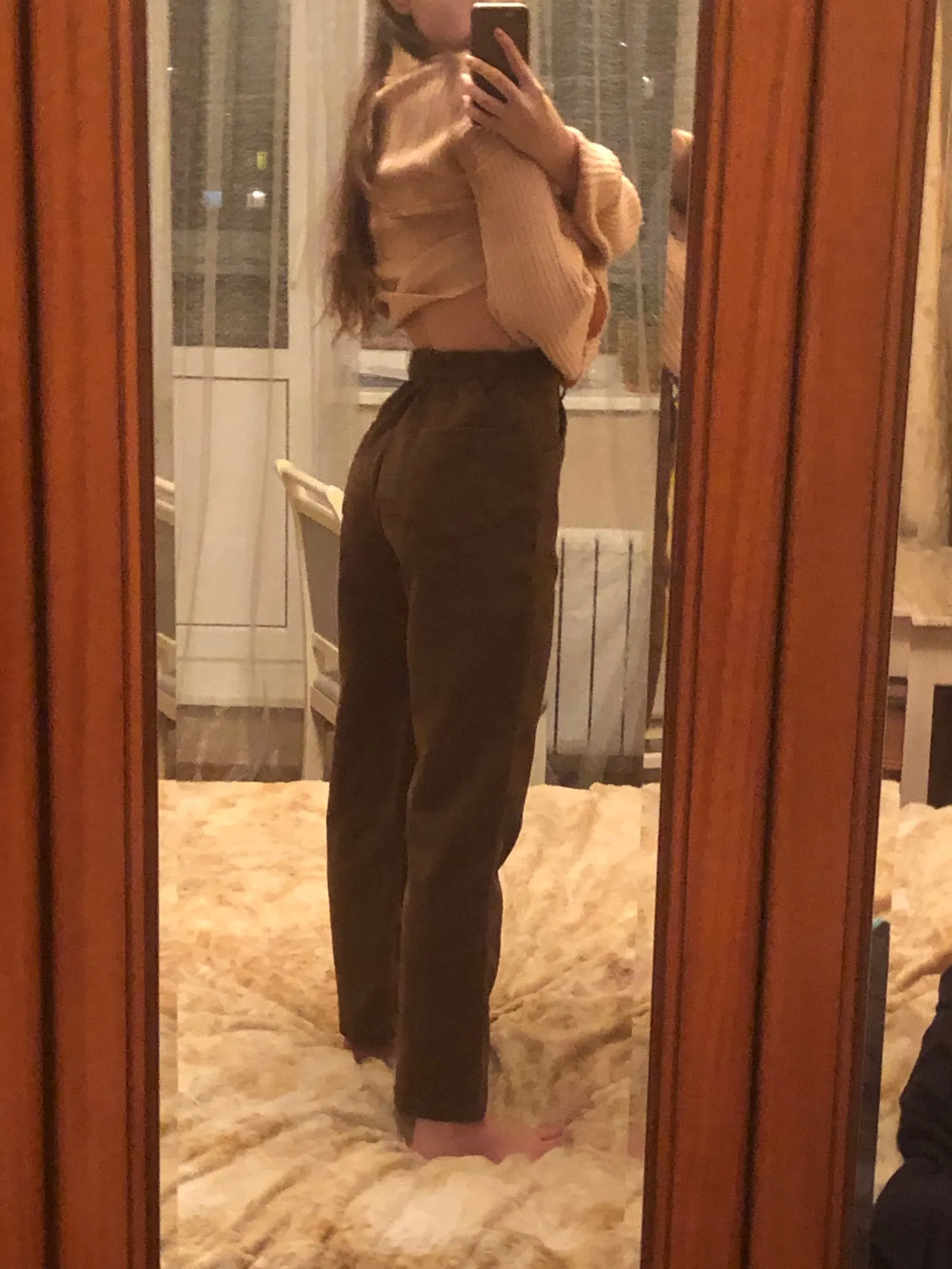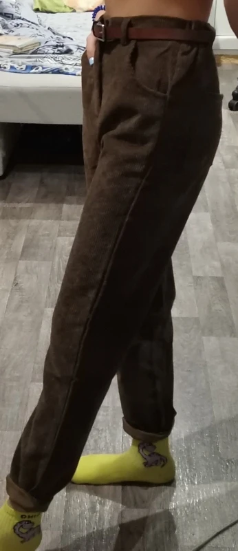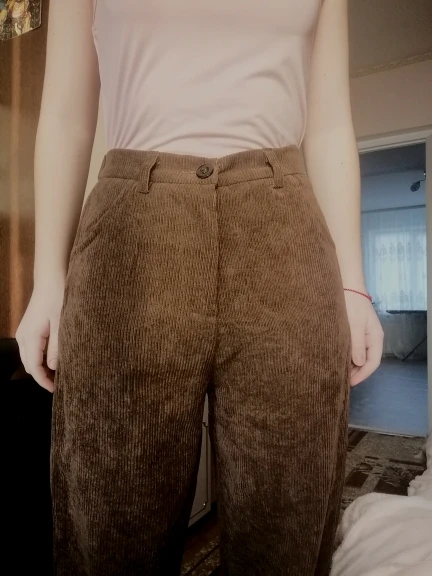 это ваау. они очень легкие и невесомые, зимой на голые ноги возможно будет прохладно, но носить их очень комфортно. материал не очень вельветовый, немного скрипит. цвет коричневатый, кофейный, хотя я думала что будет больше персиковый. на концах они расширенные, закрывают обувь, идеальные. пришли до мо за 3 недели. из минусов могу сказать то, что они совершенно не стройнят, и мои бёдра 100 см в этих штанах ещё шире. но вообще на вкус и цвет.. мой рост 1.63 и размер я брала L, неподкатанные по длине круто подошли, с подворотами не пробовала