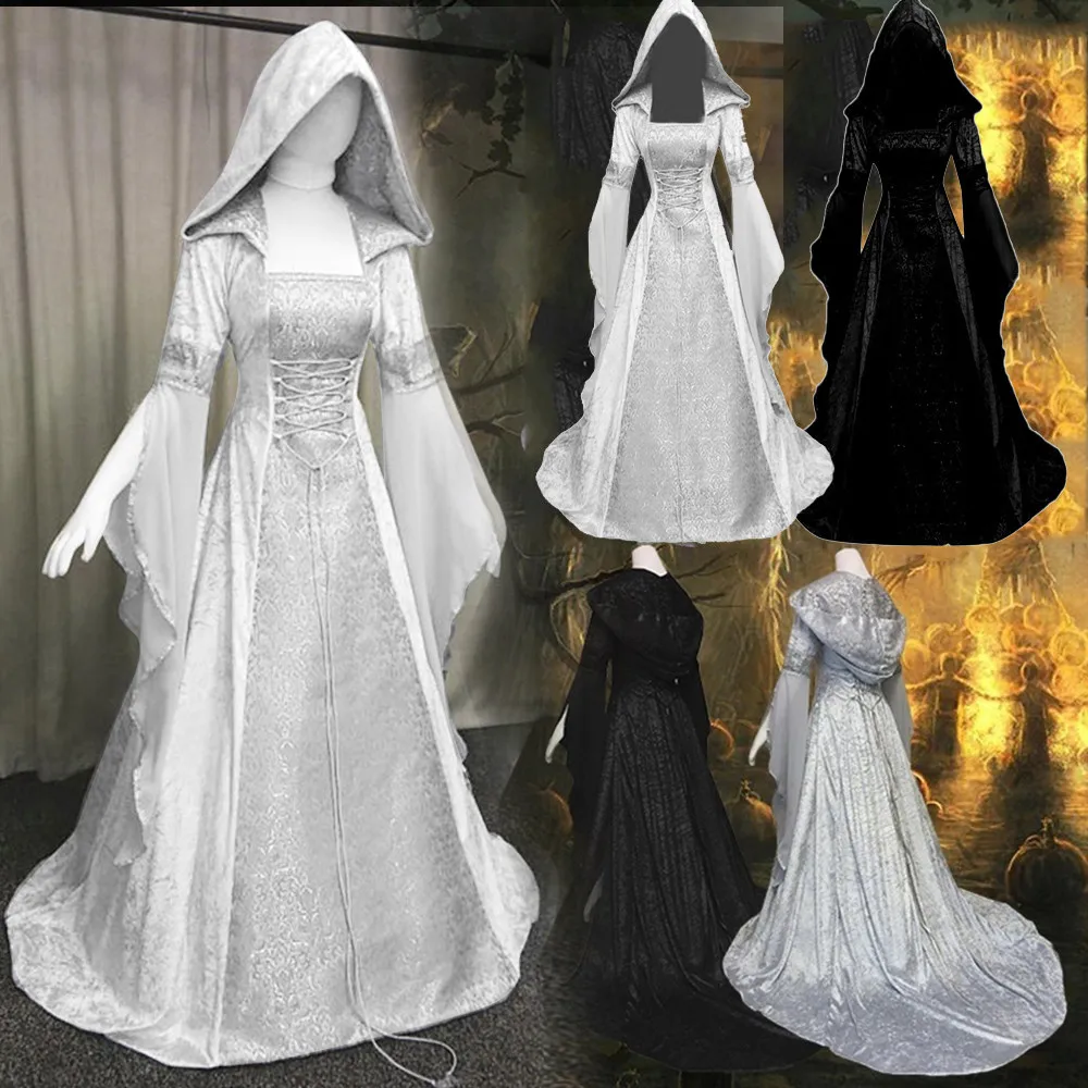 Платье для косплея, в стиле бохо, винтажное, в готическом стиле, с капюшоном, средневековое