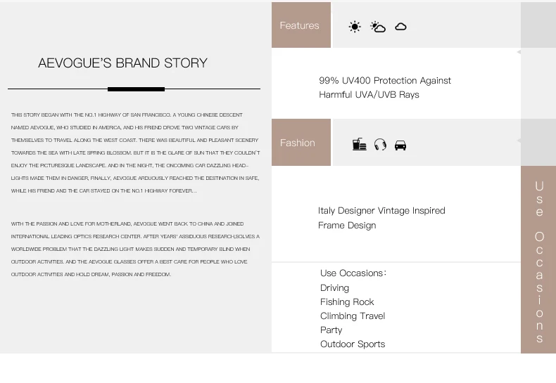 Product Function100% UV400 Protection Against Harmful UVA/UVB Rays