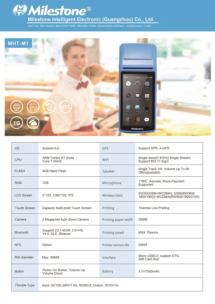 MHT-M1Smart pos-машина, Операционная система android 6,0, 5-дюймовый сенсорный экран, сверхдолгая емкость батареи в режиме ожидания 7800 мАч, термопечать, камера 5 миллионов пикселей, china telecom 2g / 3g/ wifi, связь bluetooth 3,0/4,0. Теперь эта тонкая работа и высококачественная машина-лучший выбор на рынке.