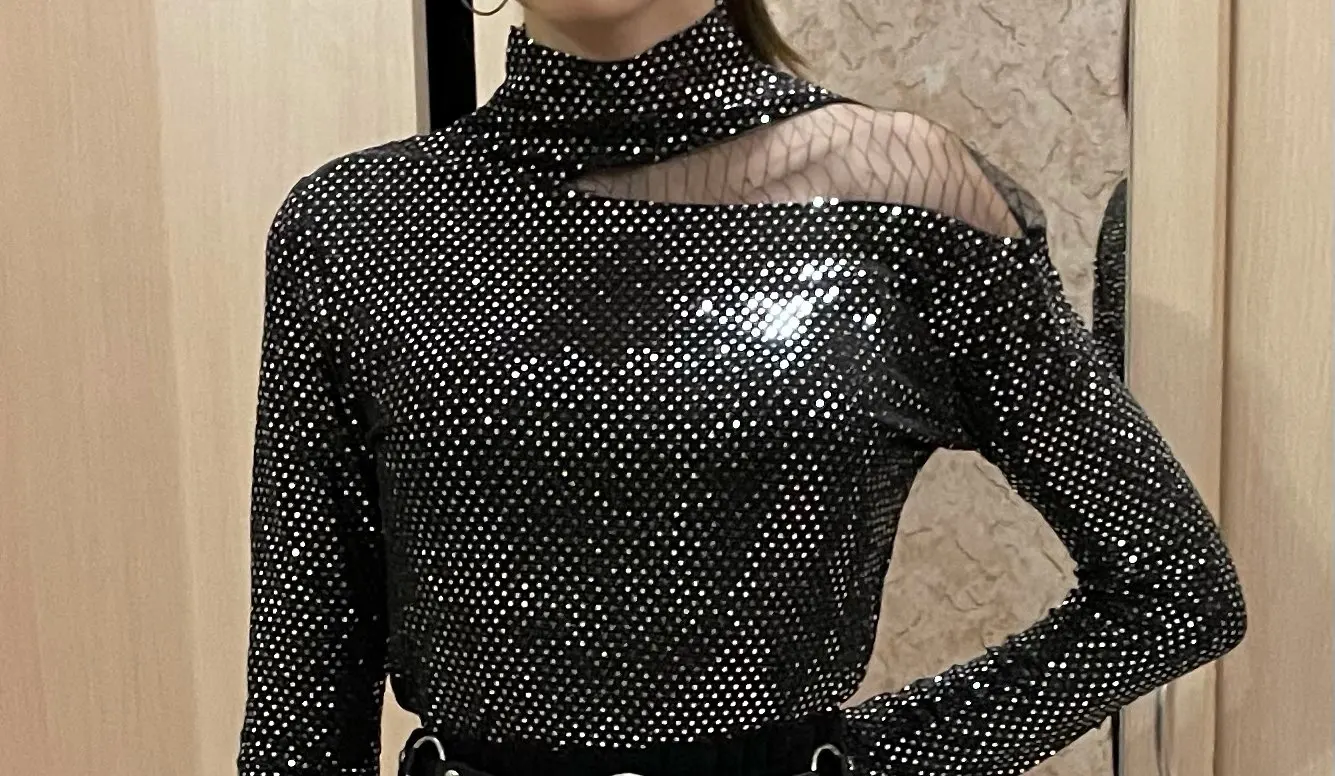 Футболка женская сетчатая, с открытыми плечами, с длинным рукавом, блестящая, DD29, 2021