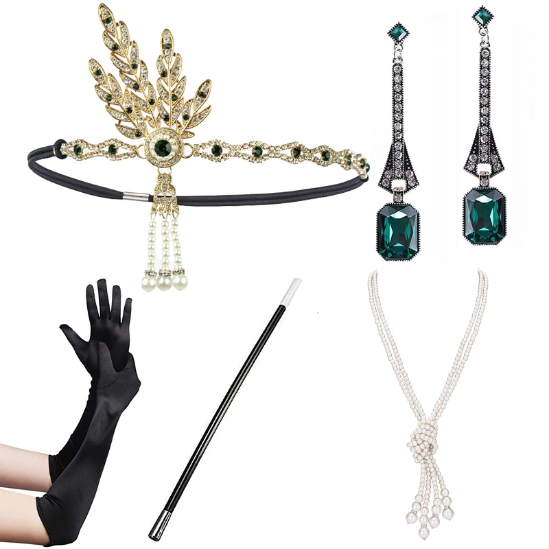 Женский винтажный комплект аксессуаров 1920-х годов Great Gatsby, Ювелирное Украшение со стразами, повязка на голову, ожерелье, перчатки, серьги, держатель для сигарет