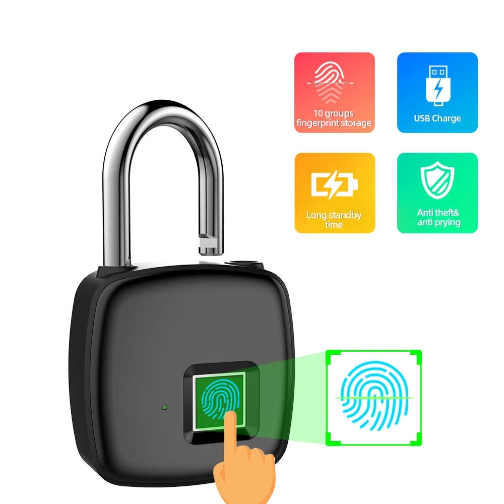 Широкое применение: идеально используется для дверей, шкафов, велосипедов, рюкзаков, шкафчиков для хранения и т. д. Простота в эксплуатации: Нет необходимости в каких-либо инструментах, вы можете легко добавлять или удалять отпечатки пальцев, следуя инструкциям руководства пользователя. 10 групп отпечатков пальцев: навесной замок поддерживает запись до 10 отпечатков пальцев (поддержка двух менеджеров). Перезаряжаемый USB: Встроенный литиевый аккумулятор емкостью 300 мАч, может поддерживать до 2 лет в режиме ожидания и может быть открыт до 2500 раз. IP65 Водонепроницаемый: может быть защищен от воды и пыли. Высокая степень водонепроницаемости позволяет применять на открытом воздухе. Со светодиодным индикатором: с 3-цветным индикатором для отображения различного состояния. Подсказка о низком заряде батареи: Когда напряжение ≤ 3,5 В, красный индикатор мигает быстро в течение 15 с. Если он находится в состоянии низкого заряда батареи, он будет оповещаться в минуту. Разблокировка при аварийной ситуации: он может быть разблокирован по отпечатку пальца непосредственно при зарядке. Превосходная прочность и долговечность: Изготовлен из корпуса из алюминиевого сплава и крючка с защелкой из нержавеющей стали. Примечание: Пожалуйста, полностью зарядите продукт в первый раз.