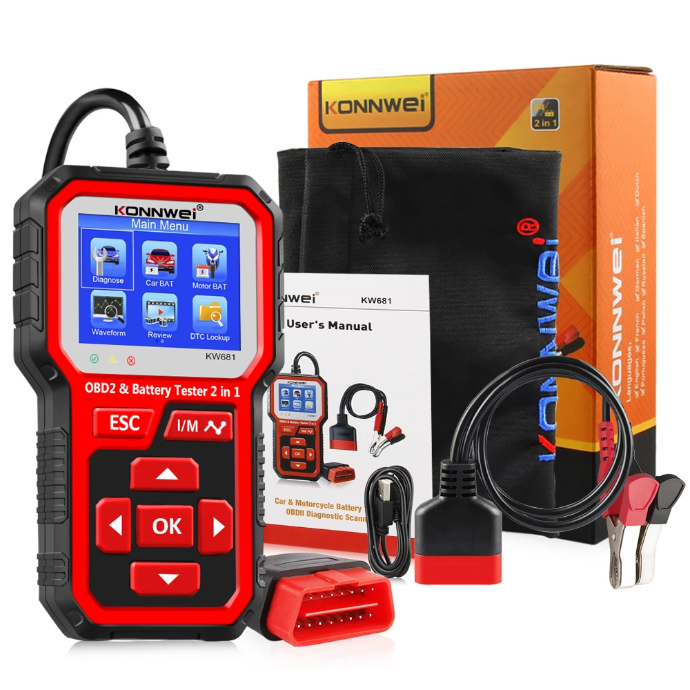 KONNWEI KW681 Тестер Аккумуляторов для автомобилей и мотоциклов + диагностический инструмент OBD II 2 в 1 сканер считывания кодов