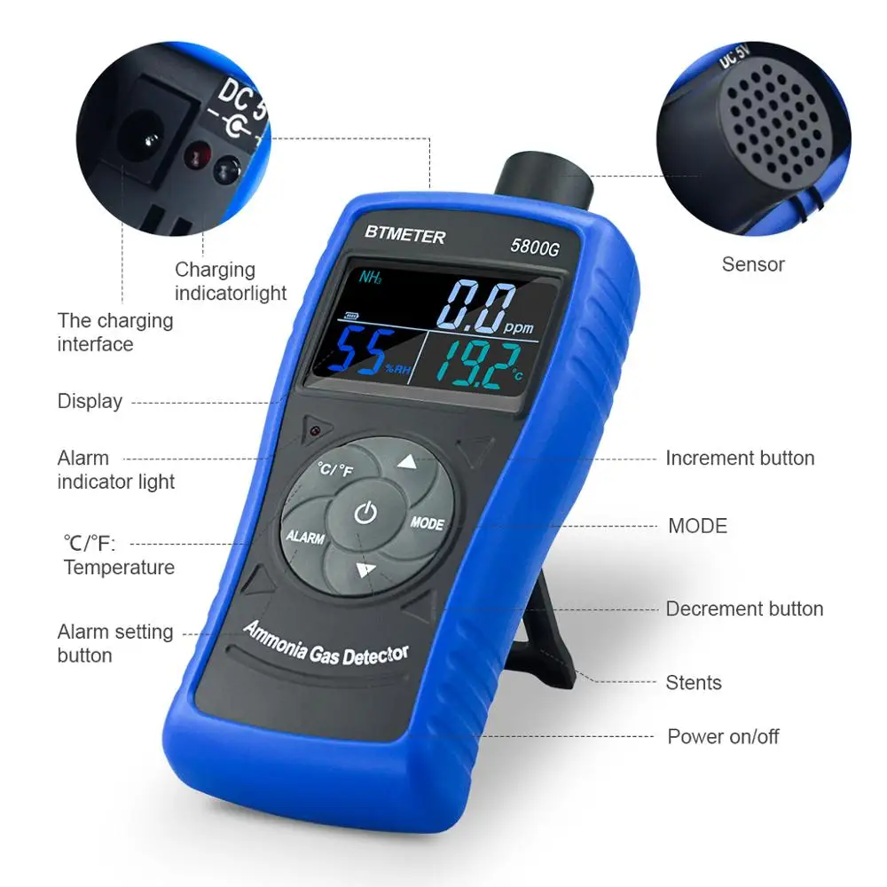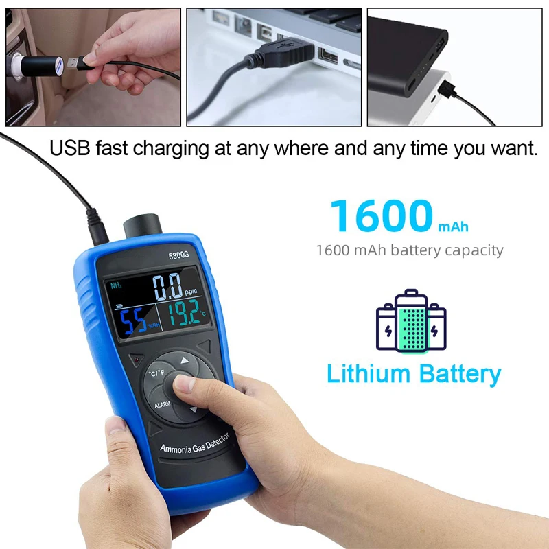 ▶Использование: птицефабрики, свиньи фермы, конюшни, животноводство, крупный рогатый скот, свалки, укрытия для животных, Рыбные фермы, управление отходами и оптимизация питания/белка и проверка OH & S▶Когда сигнал тревоги первого уровня «AL1» достигнет значения, светильник индикатора будет мигать медленно, и звуковой сигнал будет звучать медленно. Когда уровень тревоги «AL2» установлен, индикатор будет мигать быстро, и звуковой сигнал будет звучать на быстрой частоте.▶Аккумулятор большой емкости 1600 мА · ч, прозрачный ЖК-экран с подсветкой и простые в использовании кнопки с аккуратным типом.▶Прибор также оснащен функциями измерения температуры и влажности, которые могут помочь вам больше в ваших измерениях.▶Используя электрохимический принцип датчика, 5800G имеет электрохимический принцип датчик с жизненным циклом более двух лет по сравнению с другими 1-летними датчиками жизни.