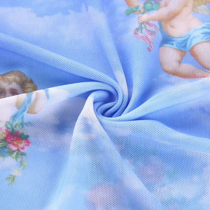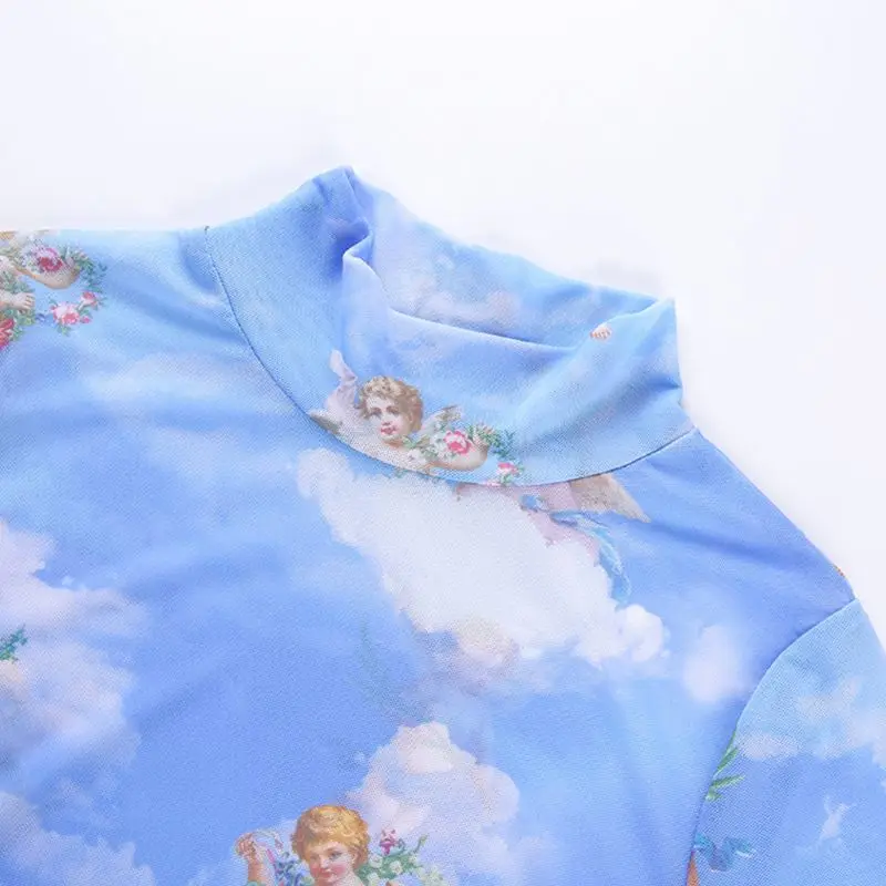 Длинные рукава, высокая горловина, водолазка, сексуальная прозрачная сетка, графическая цветная цифровая печать с изображением ангела и Купидона.
