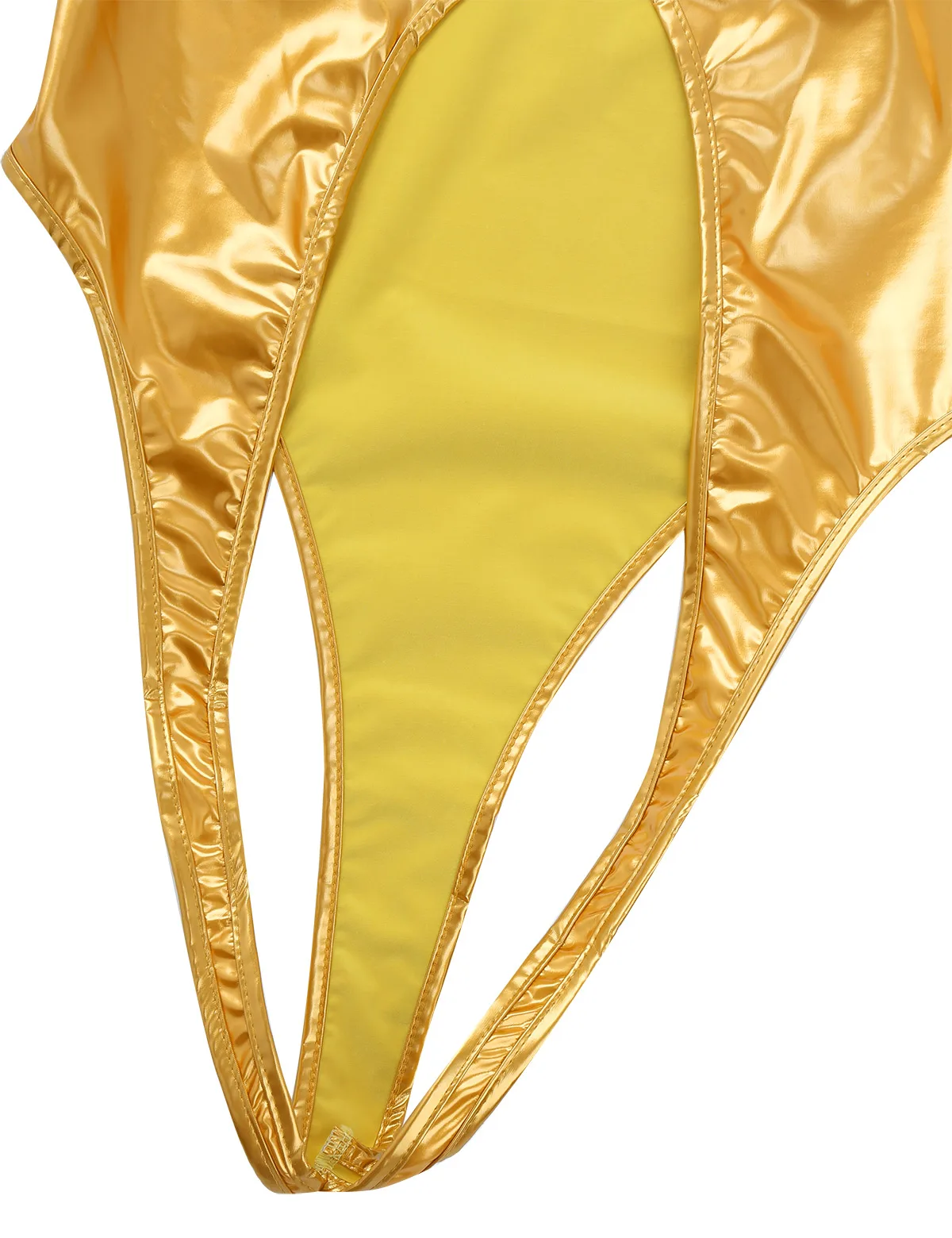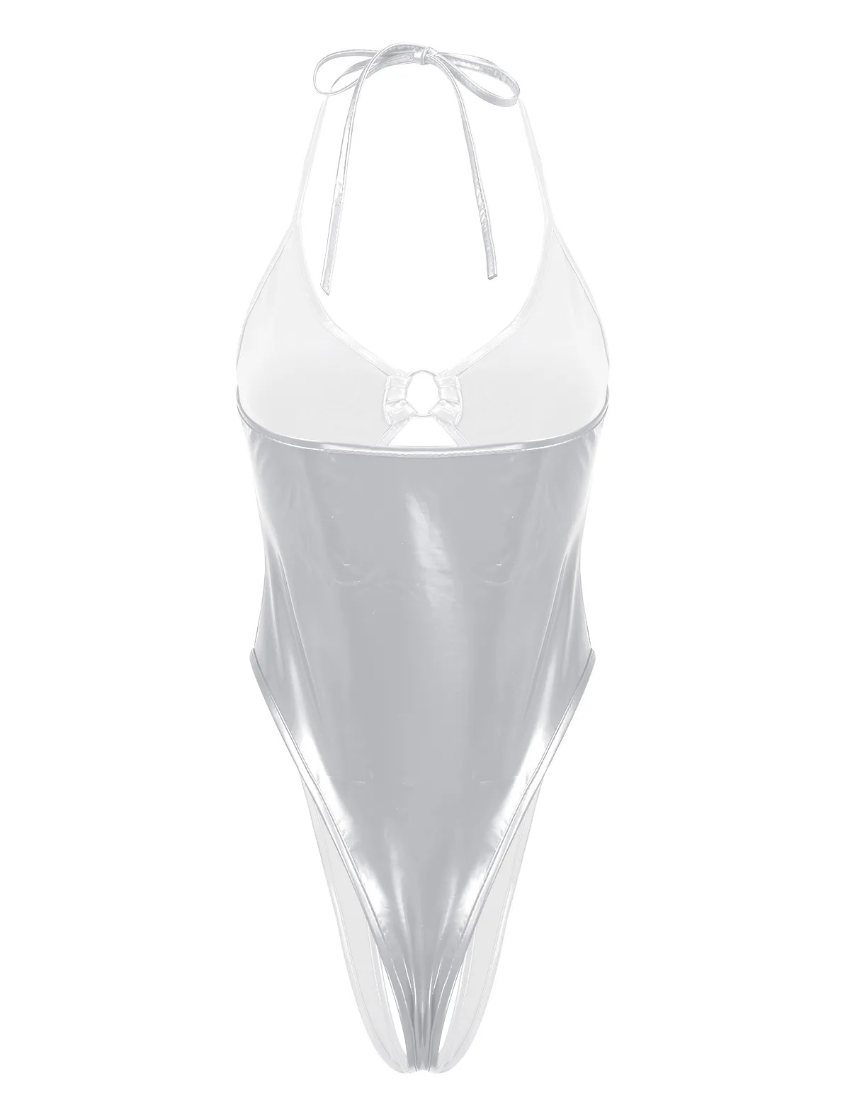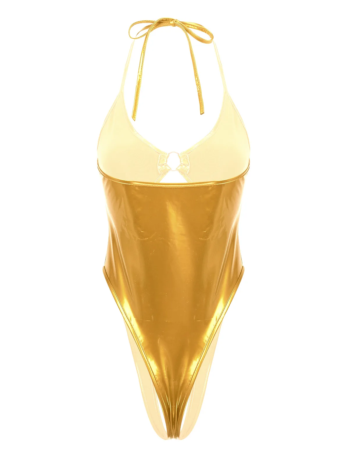 Слитный купальник, женский купальник, монокини, блестящее нижнее белье металлик, с вырезом спереди, с глубокой спиной, пикантные стринги, боди, пляжная одежда