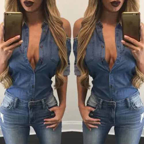 Женская джинсовая рубашка с V-образным вырезом и коротким рукавом