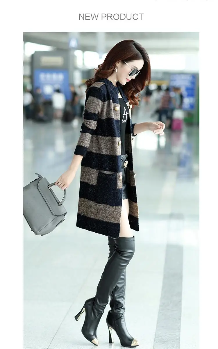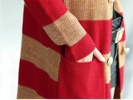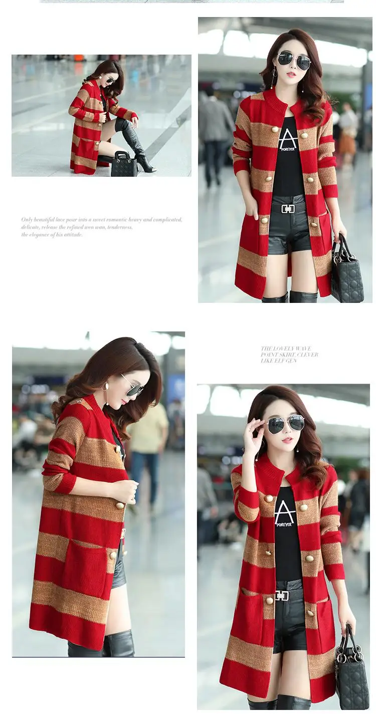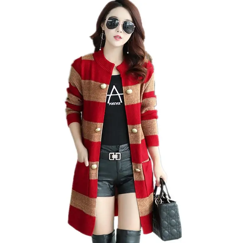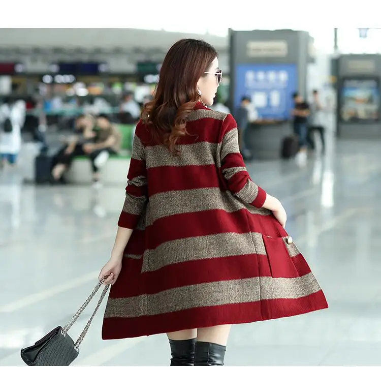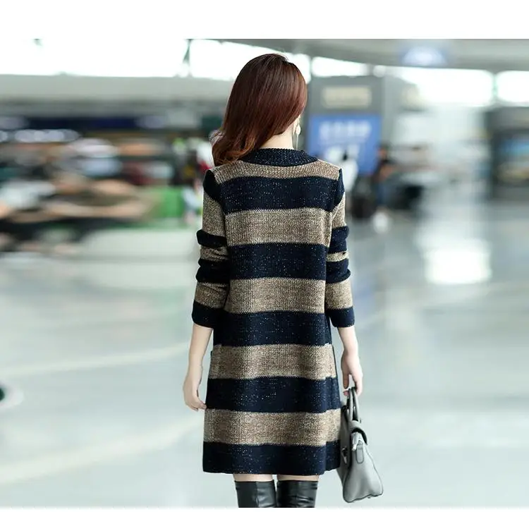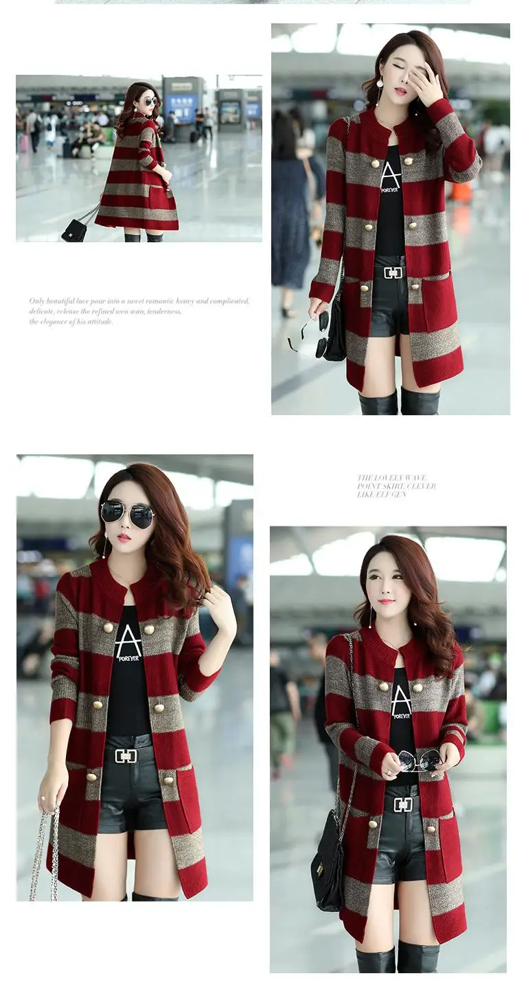 Женский трикотажный кардиган в полоску, повседневный Свободный кардиган с круглым вырезом и длинными рукавами, верхняя одежда с карманами, Осень-зима