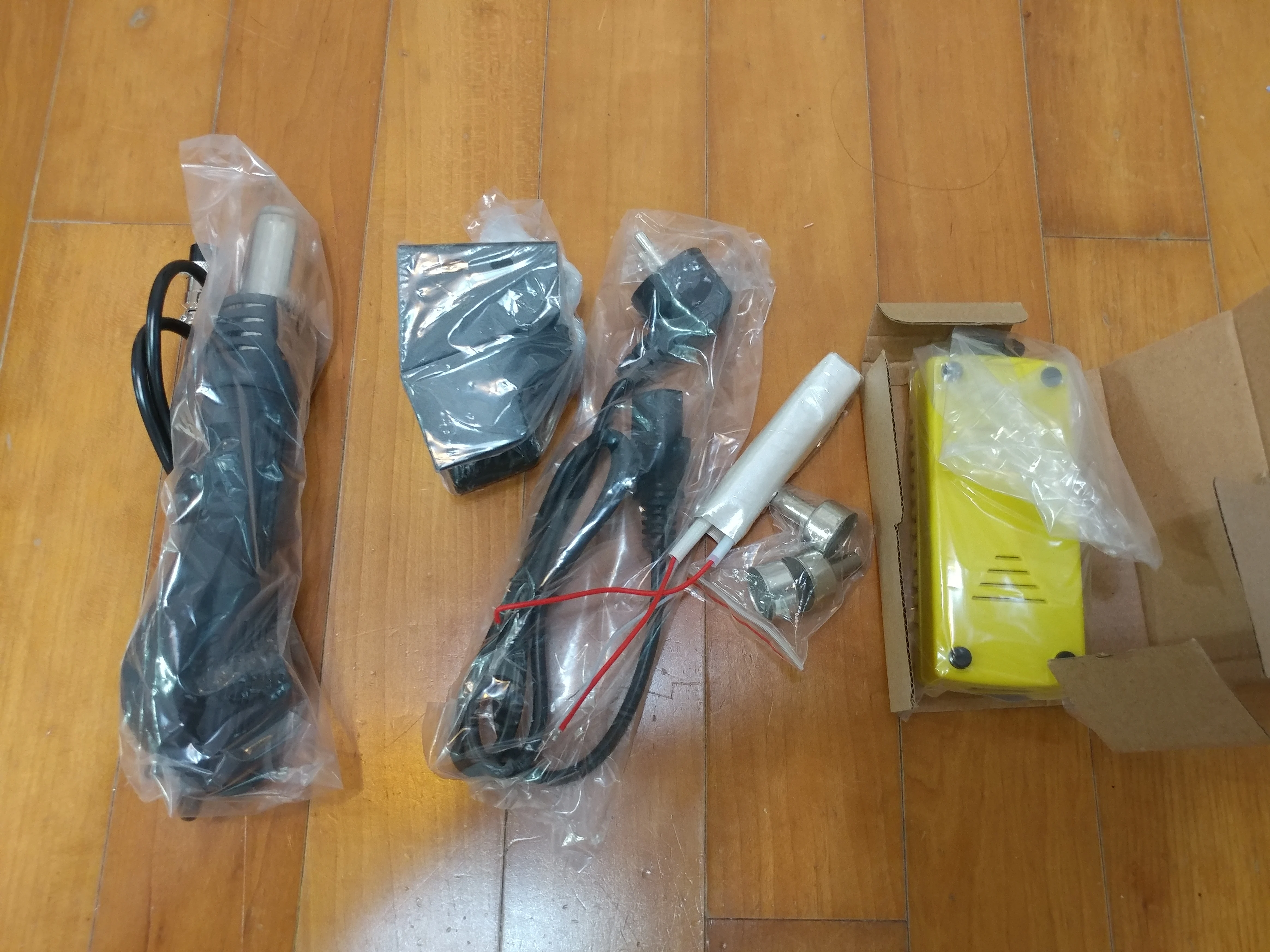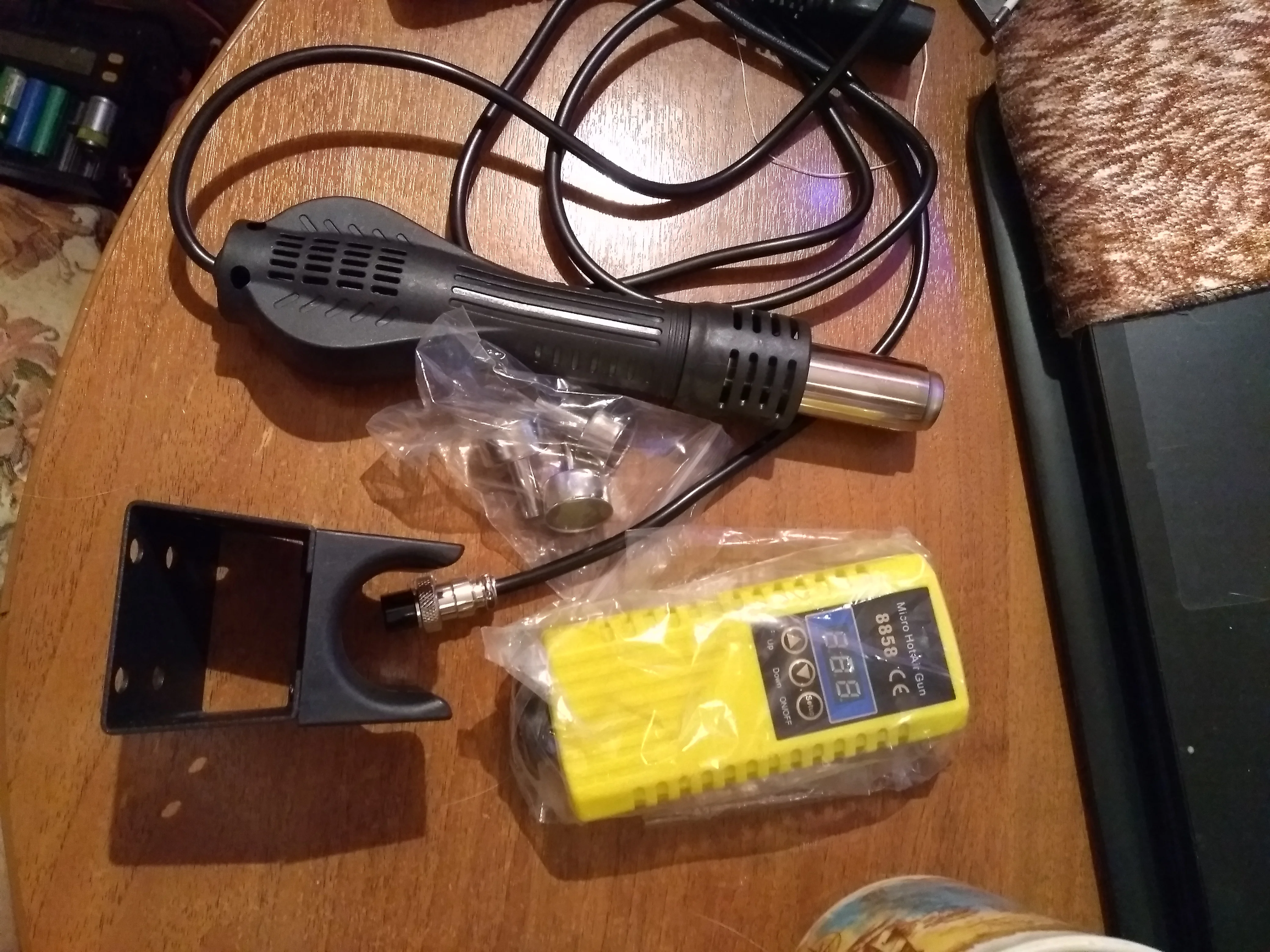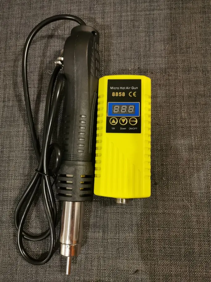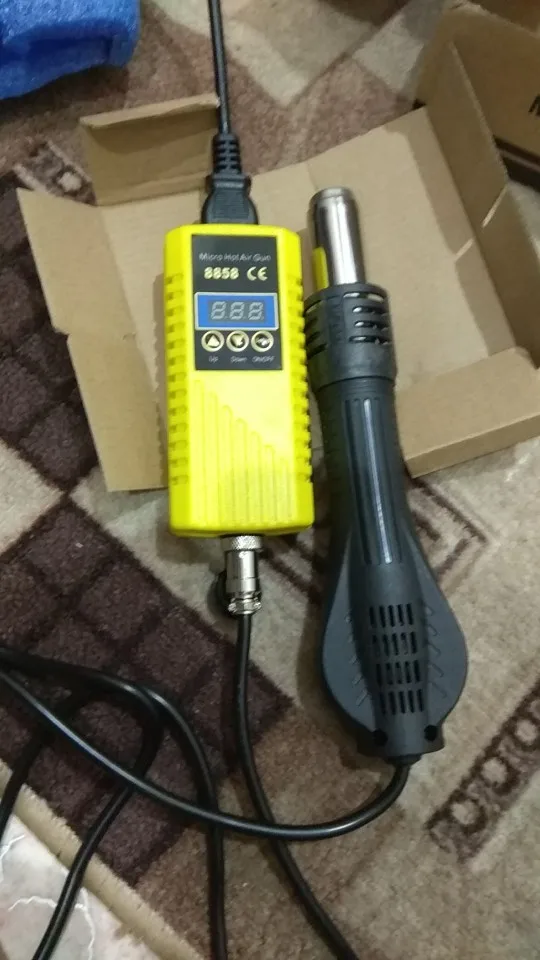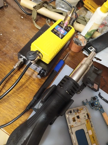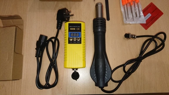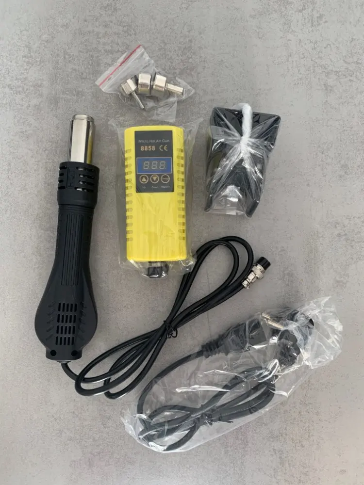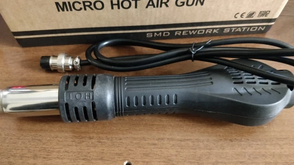 Отличная мини станция, за свои деньги. Массивная подставка, может удержать фен, даже без прикручивания к столу или подставке. Есть резистор калибровки температуры потока, маленькое отверстие сбоку. Можете не покупать с насадками, не переплачивайте, они идут в комплекте.
