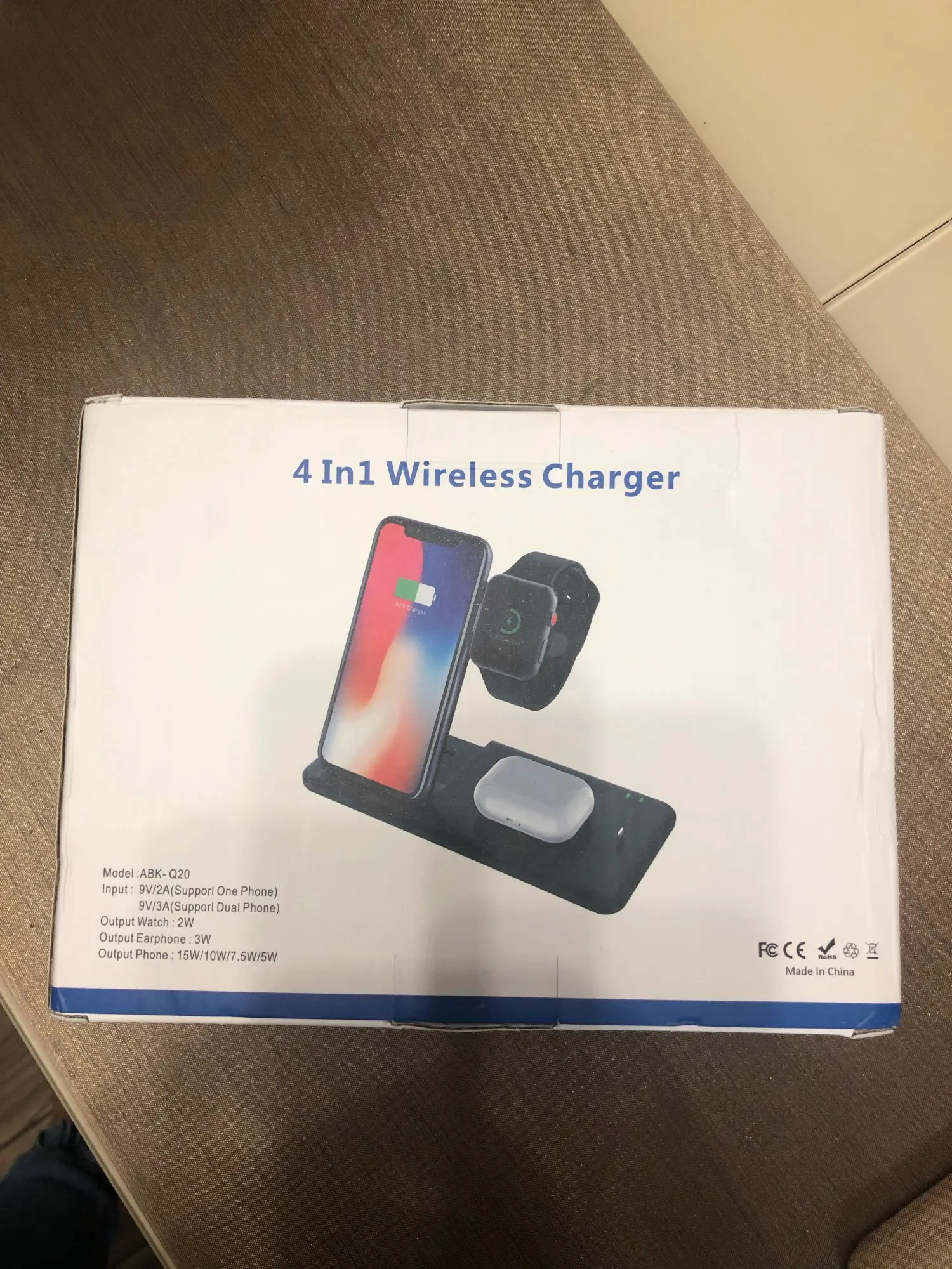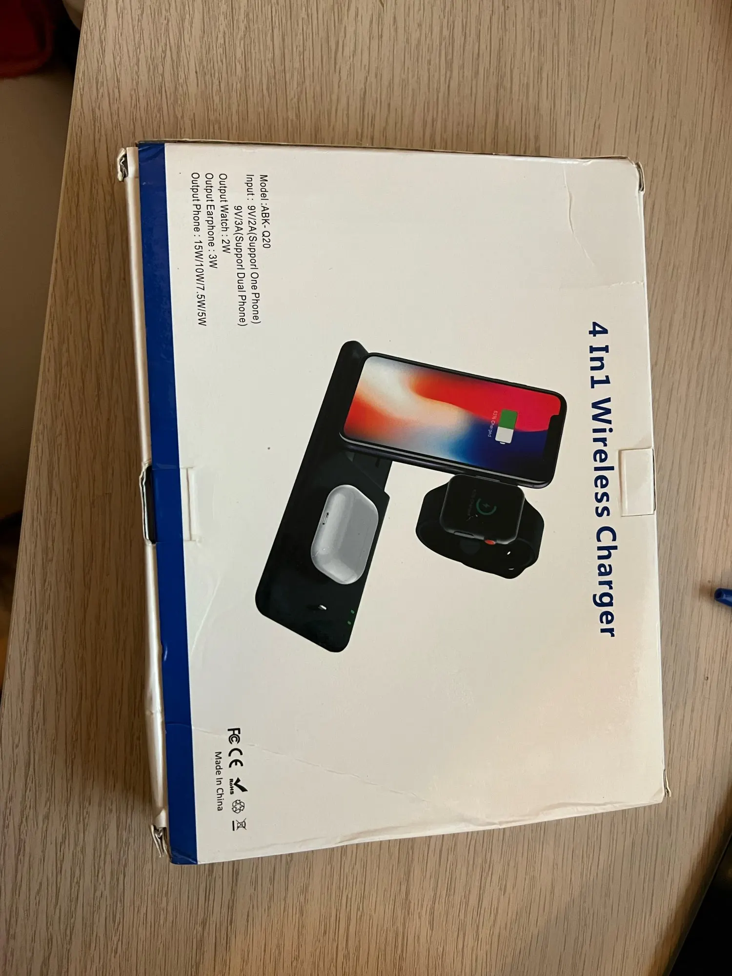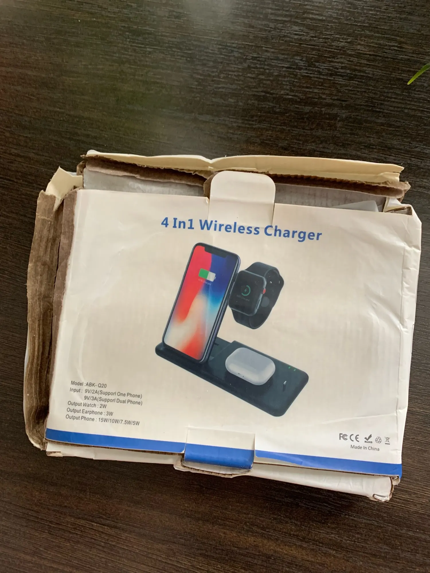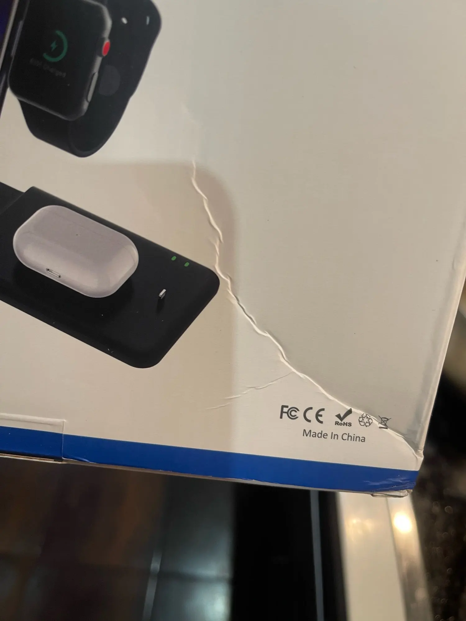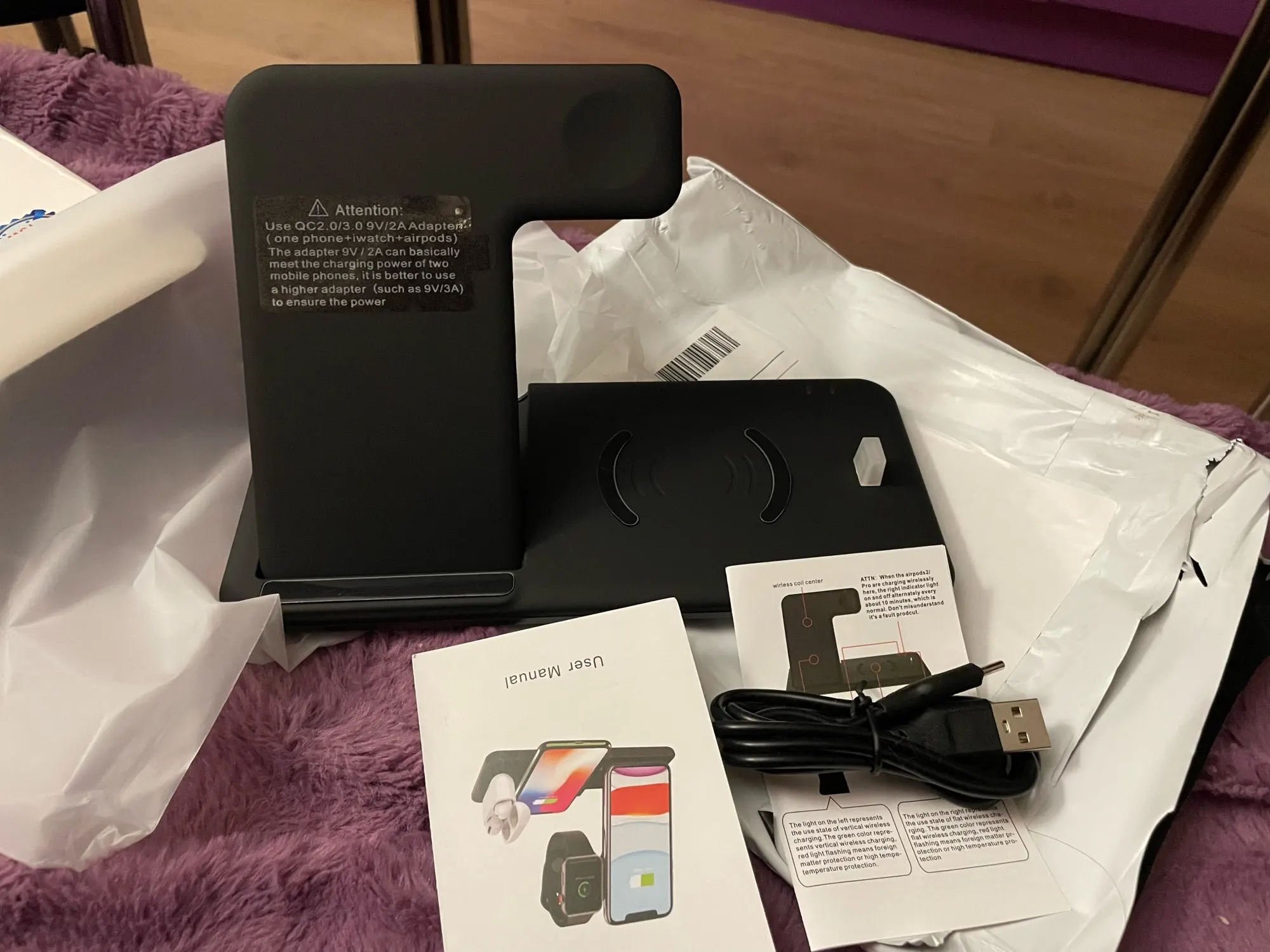 Заказ дошёл быстро. Доставили в отделение Почты России, а не в постомат, как было указано при заказе. Но так доже лучше получилось. Коробка пришла с замятием ( видно на фото), но станция в порядке. Проверил зарядку Air Pods и Apple Watch. Заряд идёт. Но часы держатся слабо. Магнит можно было и посильнее поставить. Беспроводную зарядку ещё не проверял.