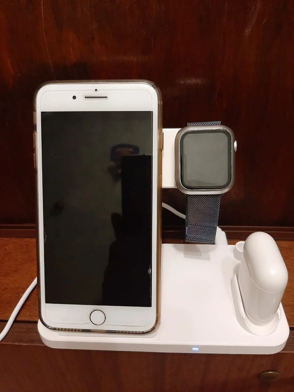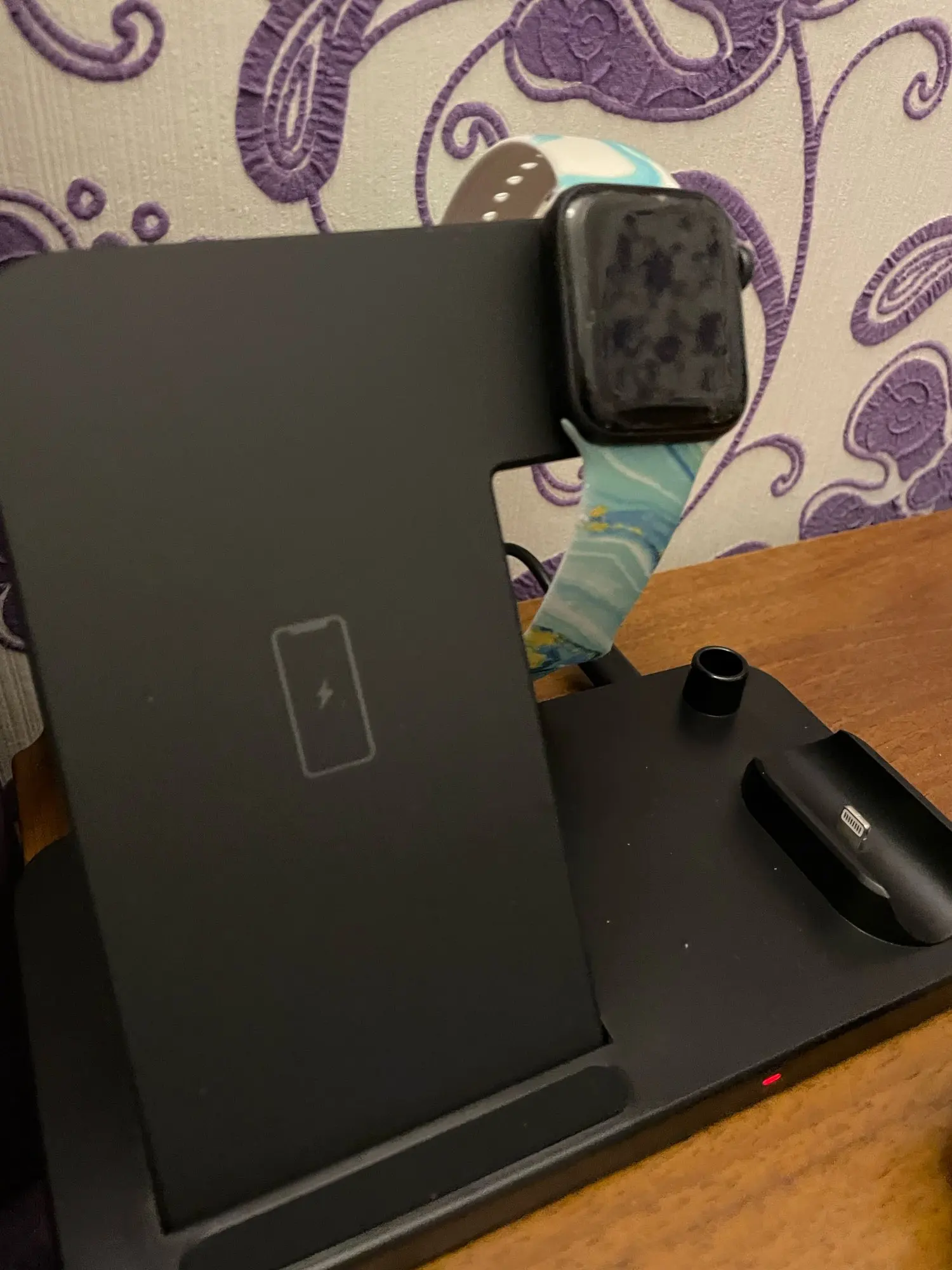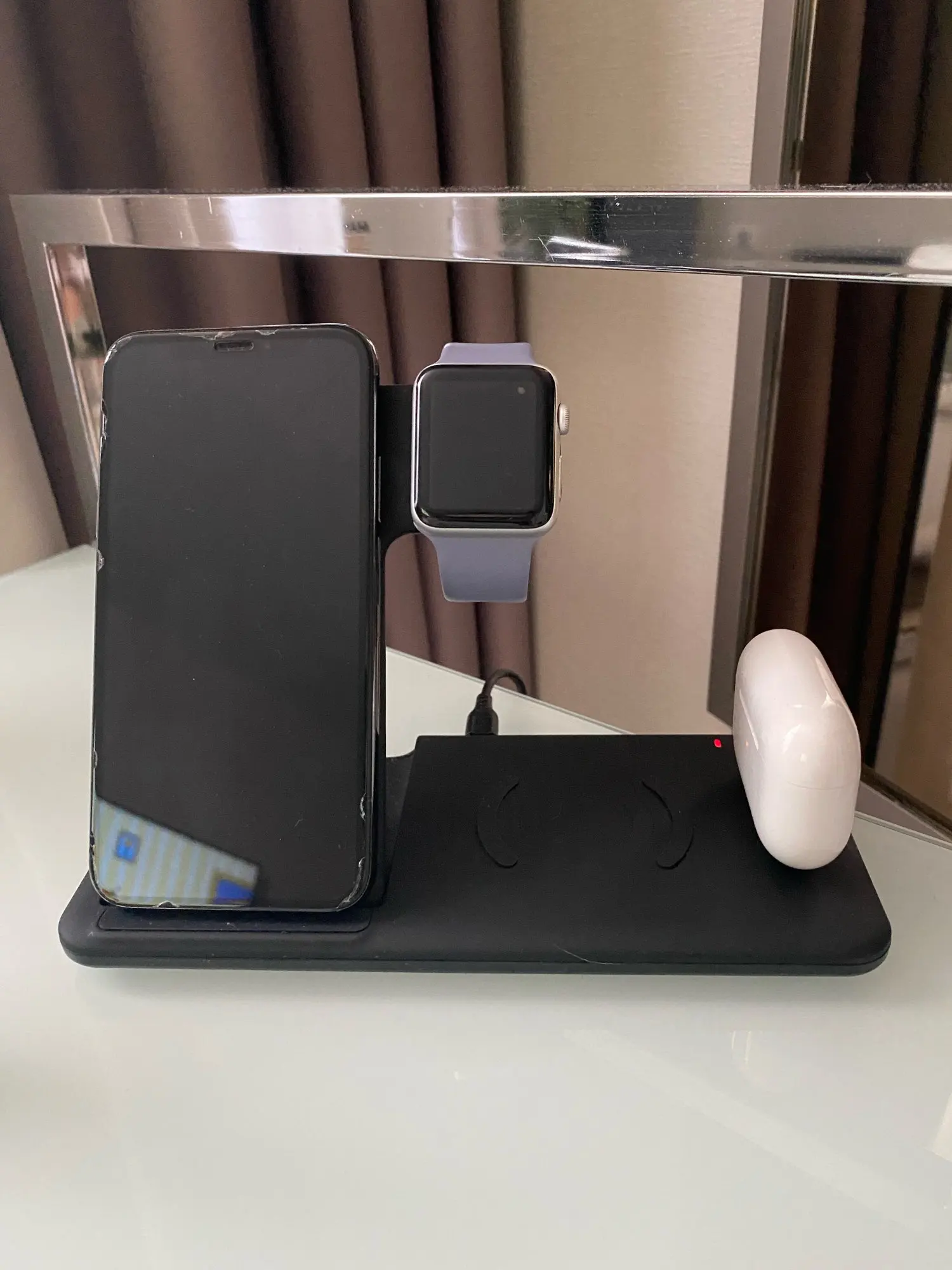 Заряжает одновременно телефон айфон 11 и эпл вотч 3, на вид хлипковата. Посмотрим сколько прослужит. Зарядка от юсб.