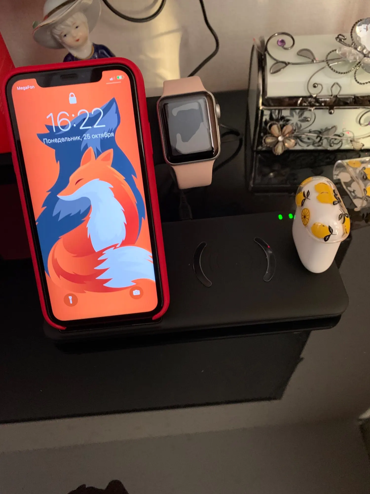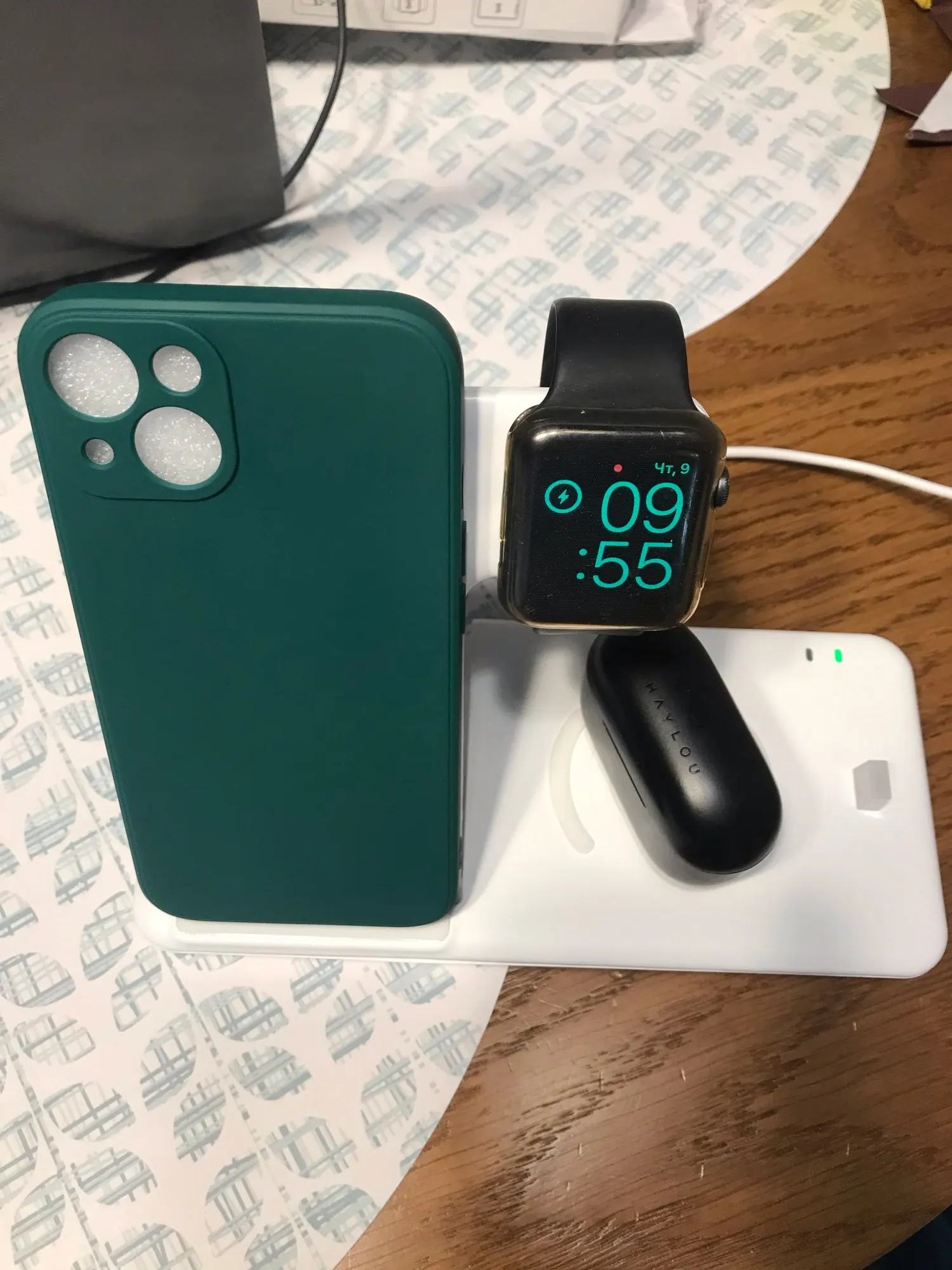 Наушники и часы заряжается, а телефон нет. Жаль. Идея хорошая.